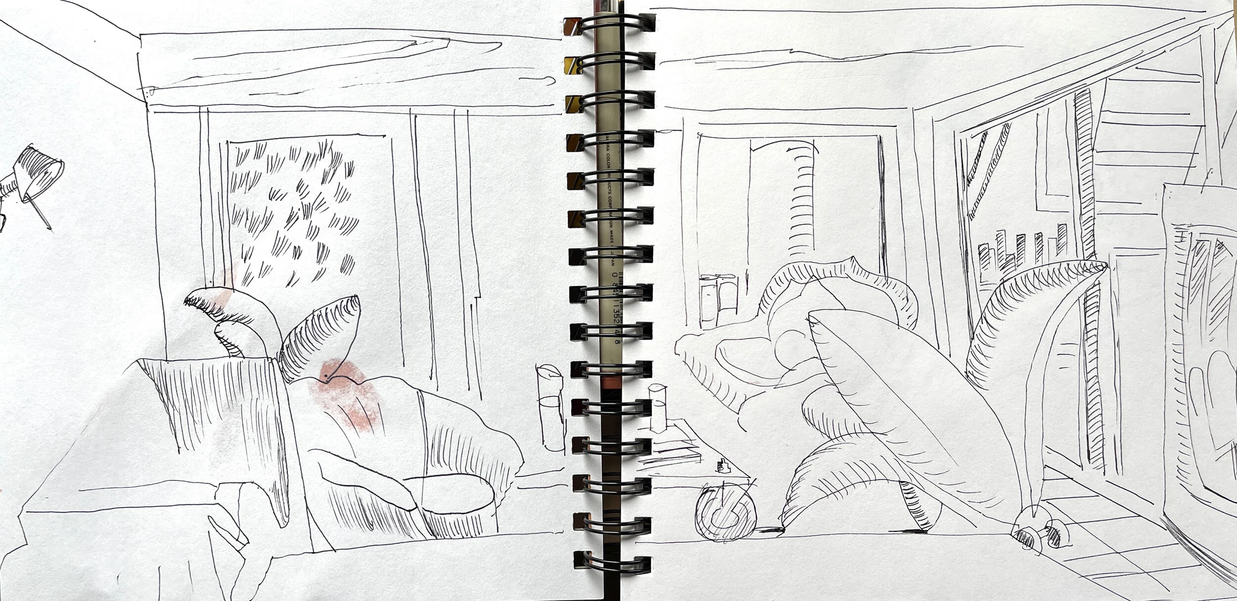 I recall deciding to make one every morning before leaving for my studio. they’re all pen & ink, except for this one you see on the right, which is colored pencil. I used our bathroom mirror to capture my reflection.