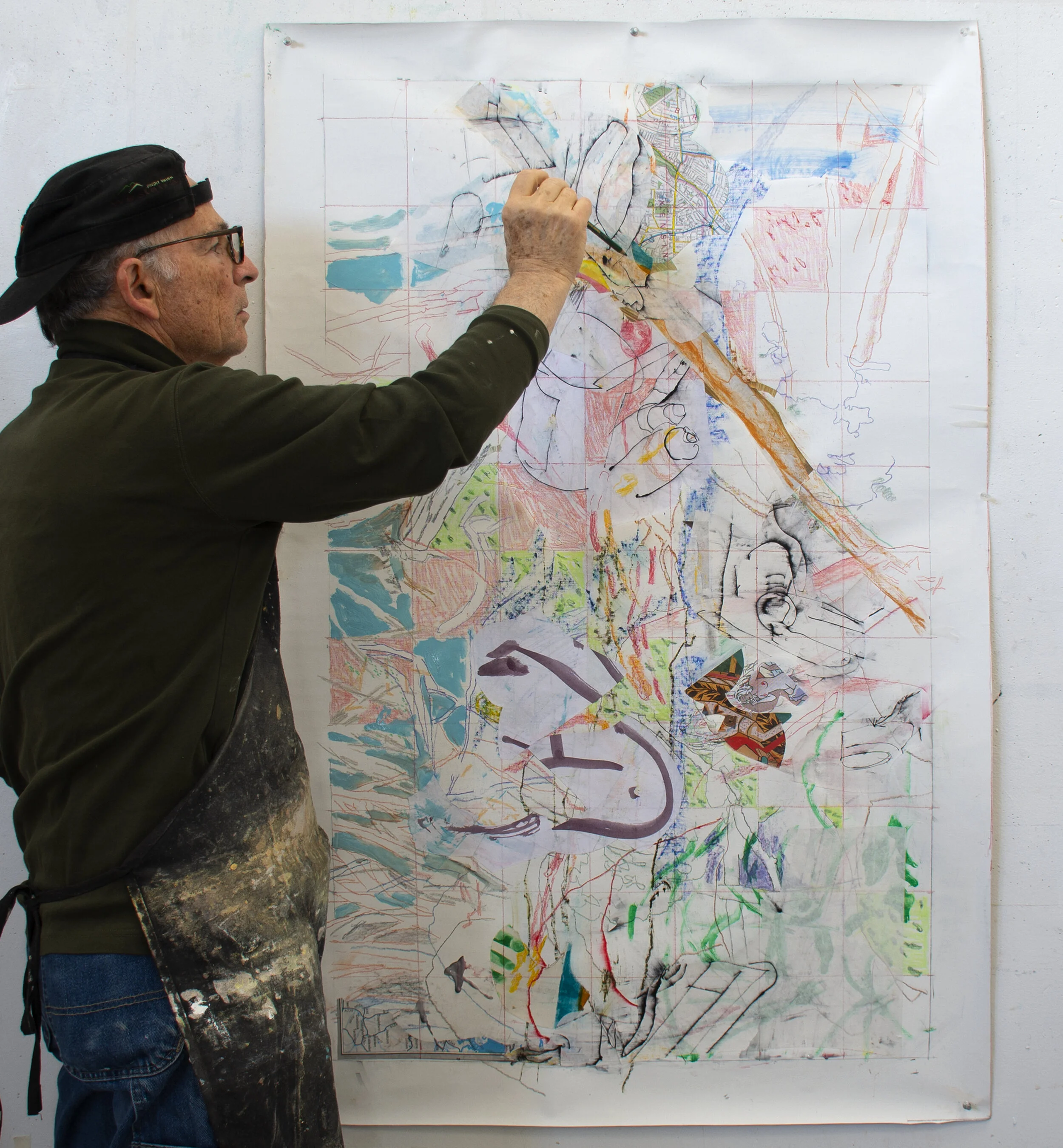 11:27 AM: I continued work on this new piece this morning and about midway into the process, I flipped it 90°. compositionally this makes a lot more sense. new blue marks intended to indicate sky are now found on the left. and a pink-red 4 inch square grid in colored pencil has appeared, covering the entire image.