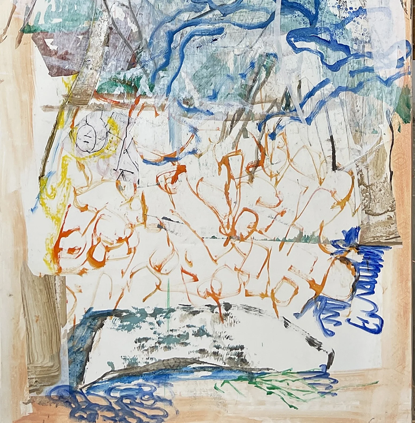 5:51 PM: i spent the morning in my studio and had to leave about 11 am so we could get to our salida appaointment this afternoon. during that space of time, i went over 5/30/2021 creek oil with titanium buff, which i’ll likely scrape and wipe over tomorrow morning, so that important passages remain and the overall busyness calms down/.