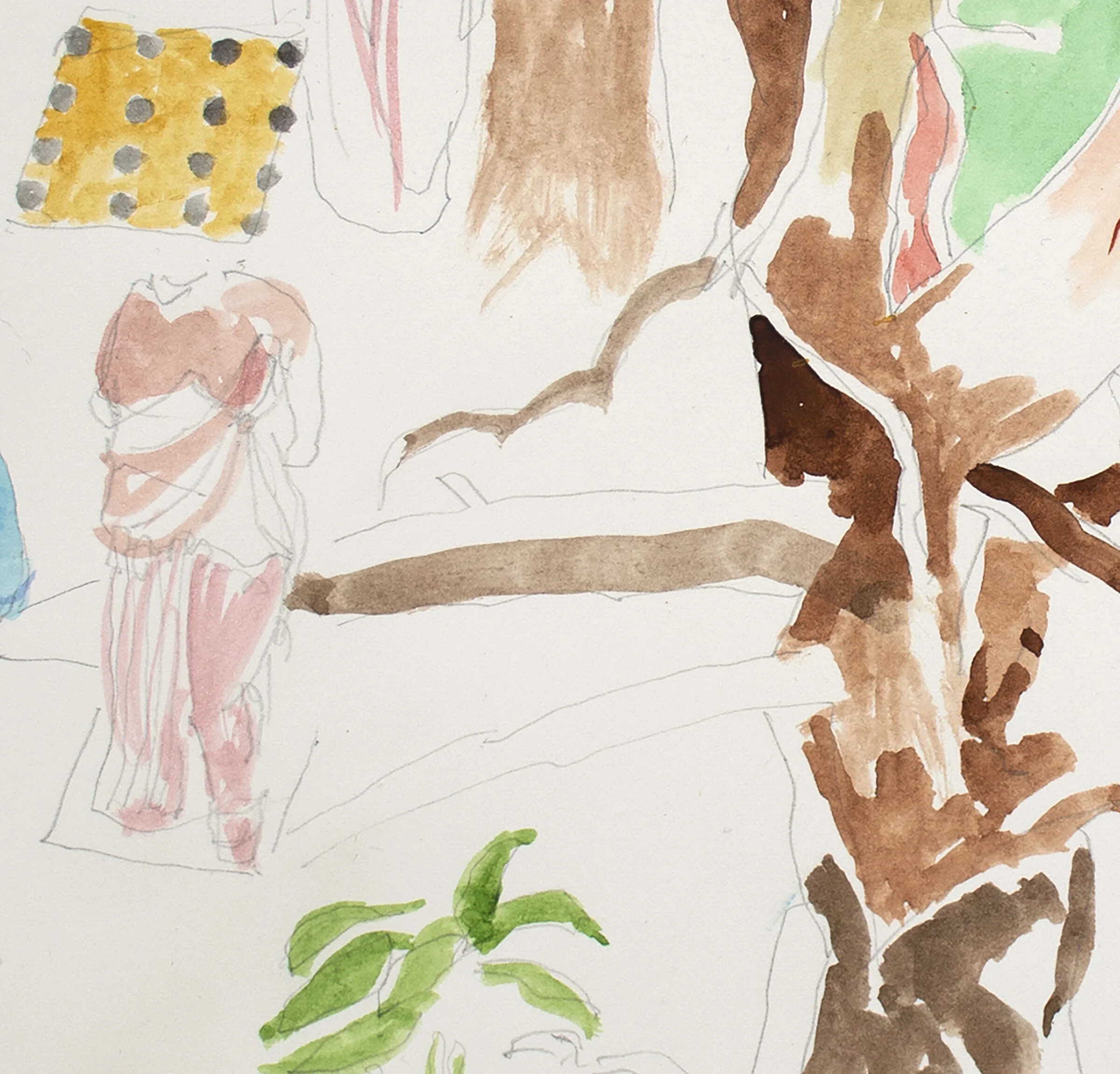 1:13 PM: I continued work on the new watercolor this morning. i’m going very slowly; as it evolves, each successive stage stands alone as a completed work. so it’s up to me how far I take it. I do like how suggestive the white spaces are.