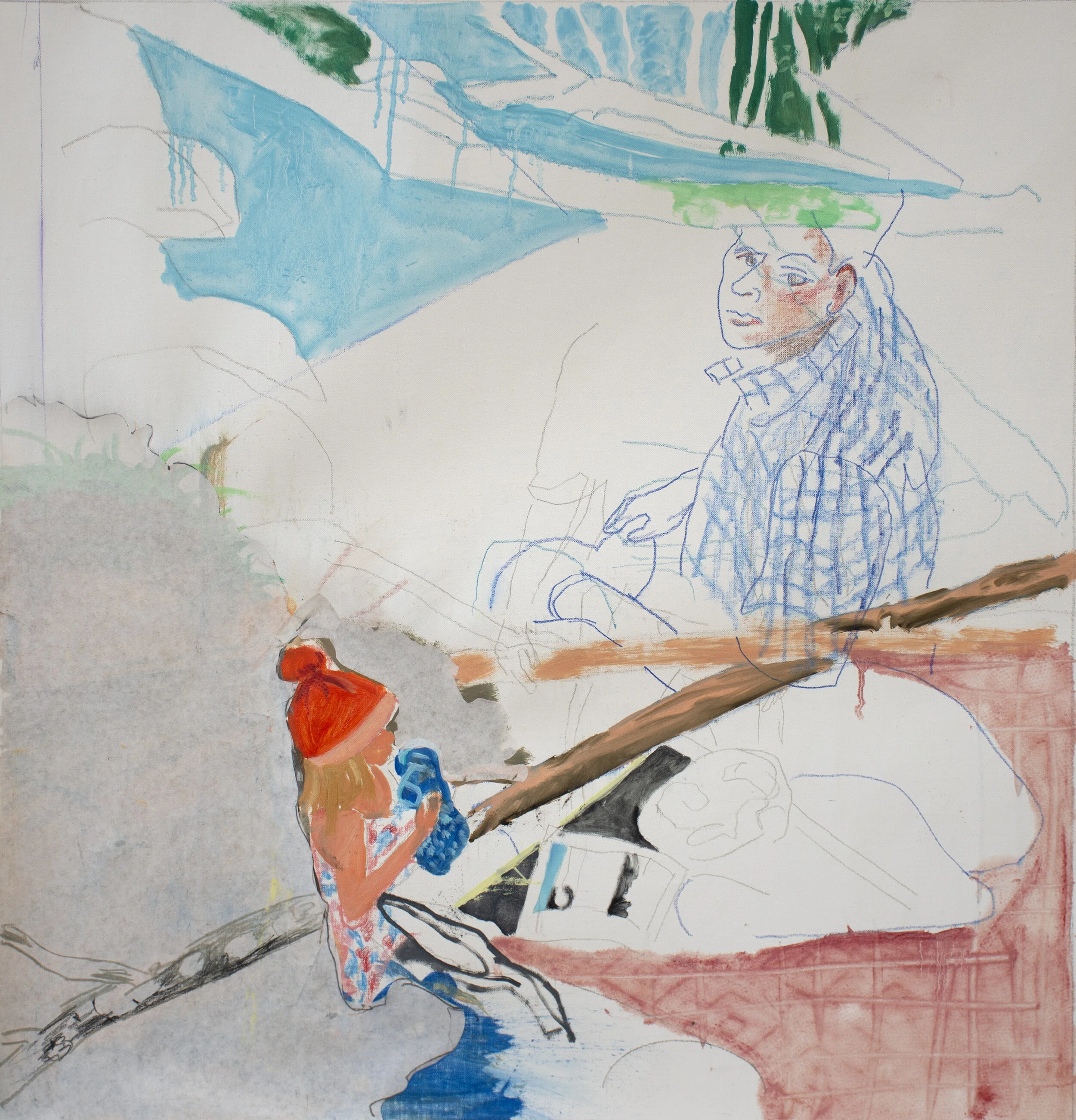 2:52 PM: I also made progress on 7/10/2021 creek oil. an additional figure viewed from above has appeared, looking at us with an ill defined expectation, as if perhaps he was asking that we complete the lower portion of his body. that dark area to the left of the little girl has gone, giving the composition more freedom. and permitting a continuation of the diagonal log. and a bit of blue has appeared beneath the little girl, a counterpoint to the blue fluffy toy she holds.