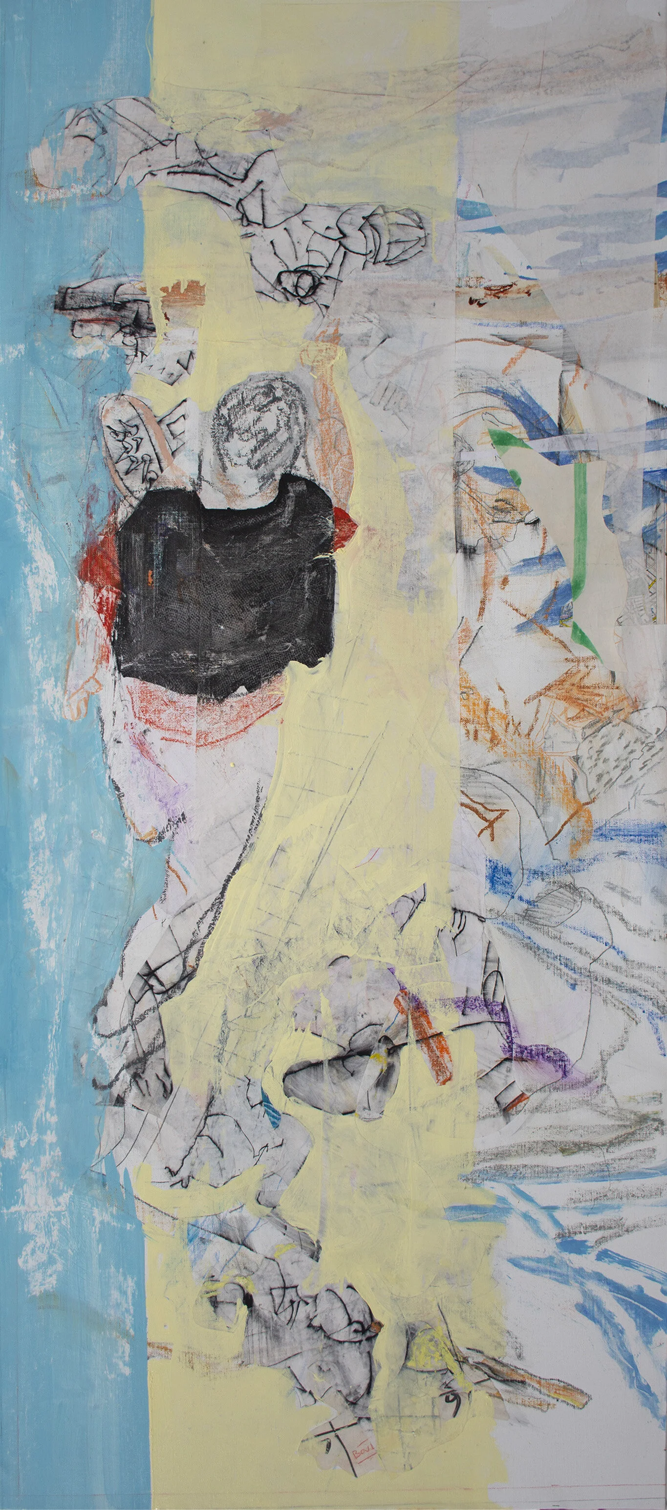 3:44 PM: ABOVE: and here’s the next stage, with the addition of a vertical stripe of yellow next to the blue. some scraping has also taken place, breaking up the blue somewhat, as well as the black sweater over his shoulders. it’s almost 4pm & i’m burnt out. plus, we’re expecting the septic truck any minute, to come empty our 2 tanks, one here & one at the house. so i’ll pick up where I left off tomorrow morning.