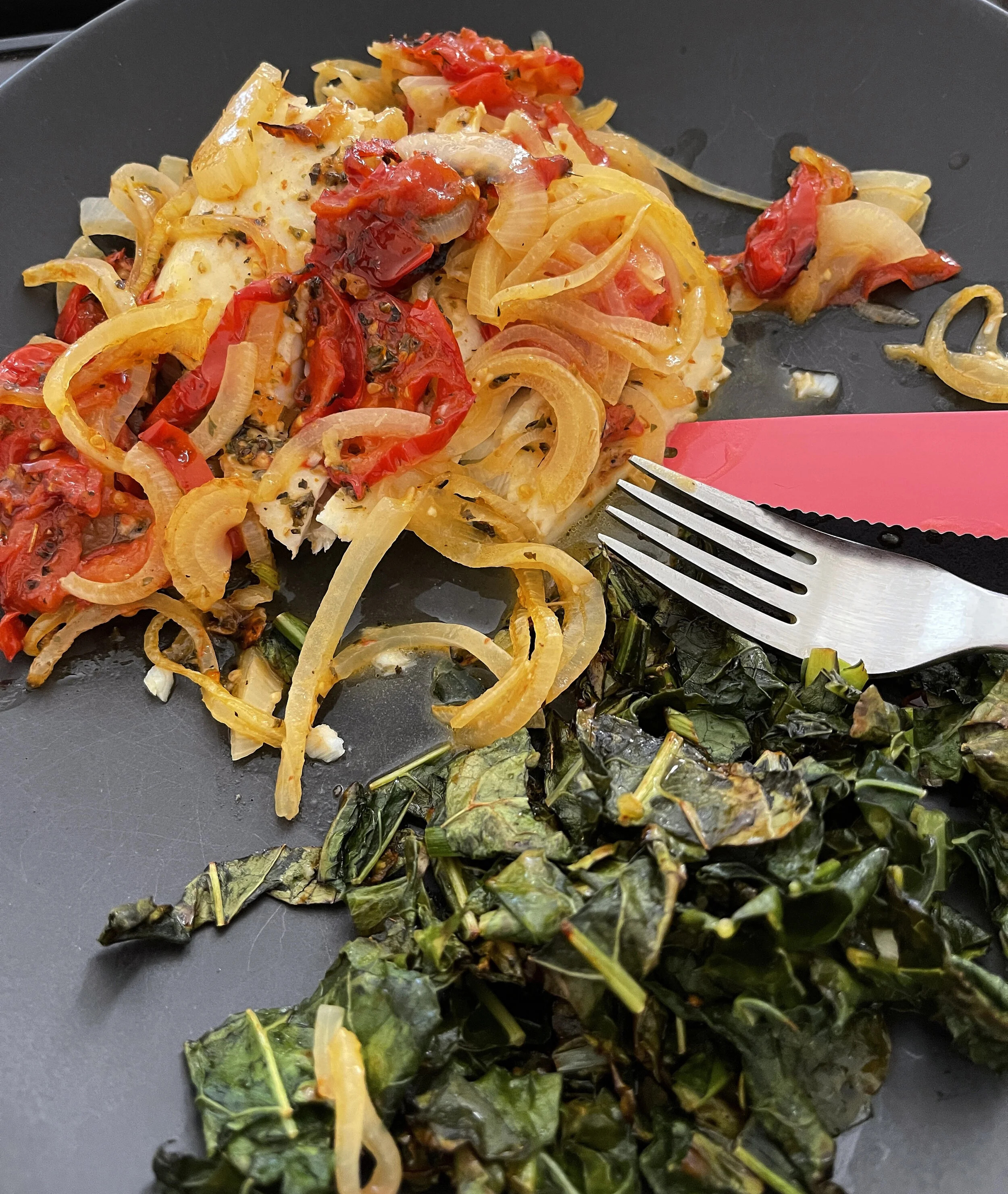 fresh caught alaskan halibut smothered in onions & tomatoes
