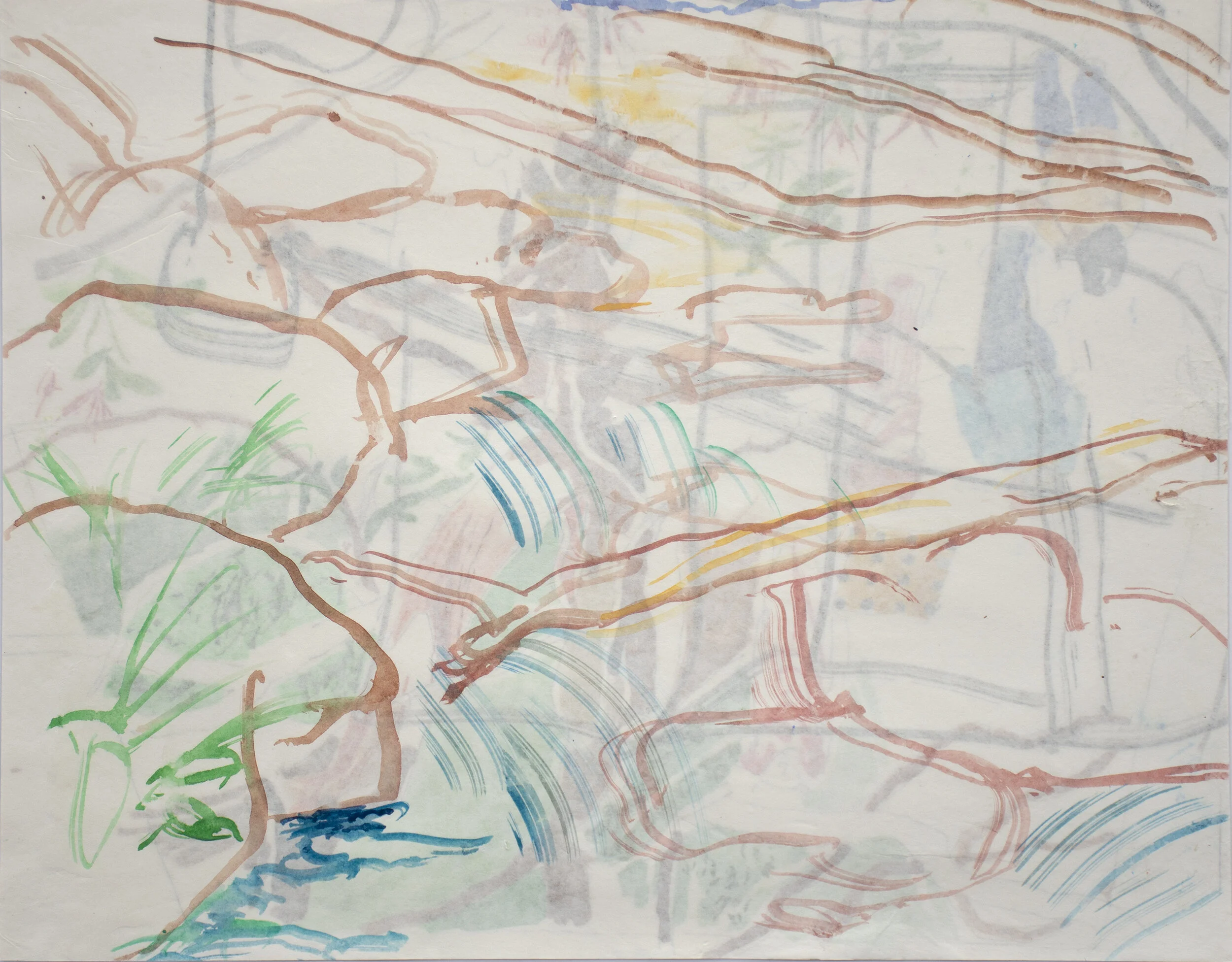 after gazing at 7/4/2021 watercolor/collage last night & this morning, I decided it needed a radical solution. so I covered the entire composition with semi-transparent white paper, which allows a ghost image of the underlying painting to show through, then I painted on to of that with a diluted wash of watercolor, using my fan brush.