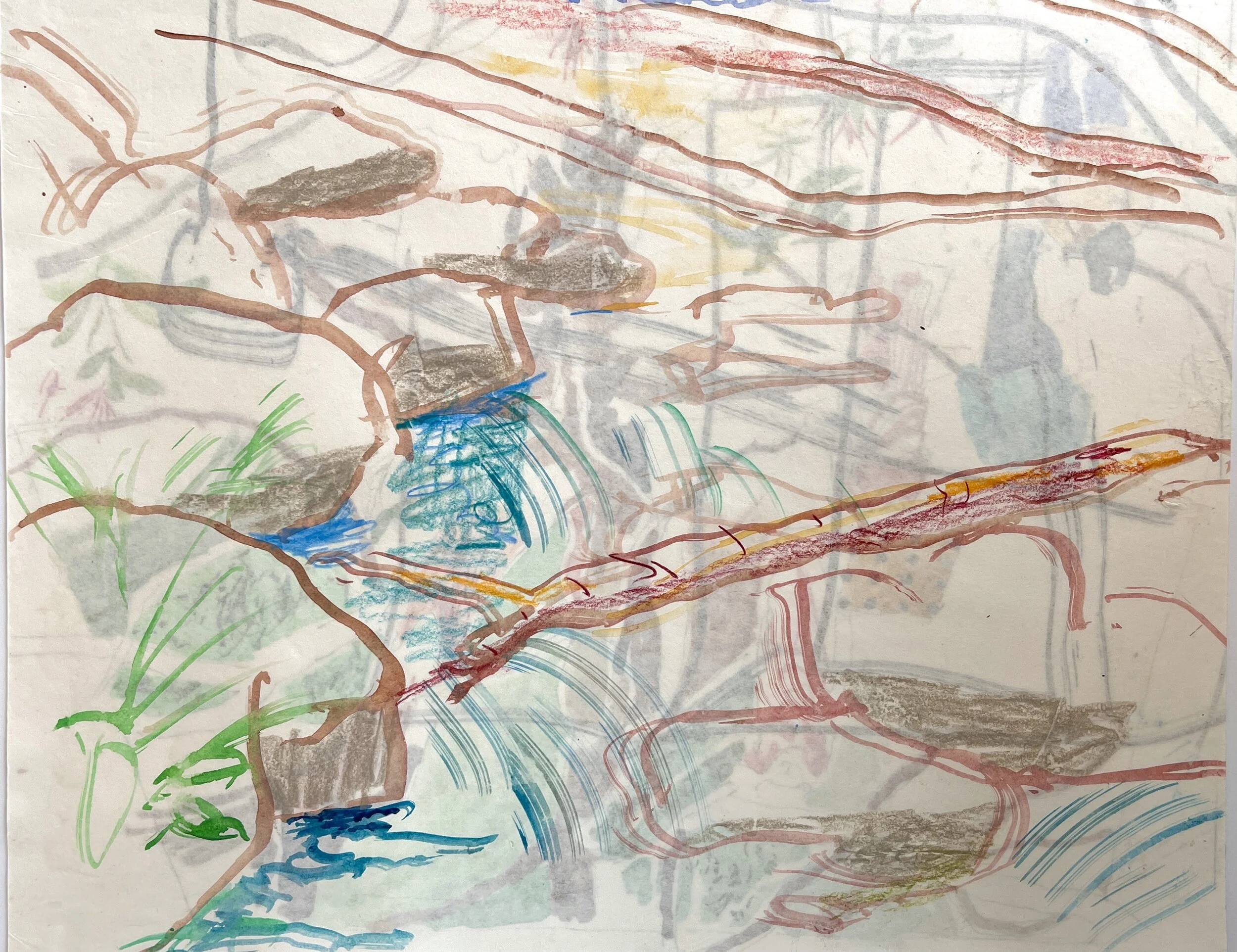 i’m working on 3 different paintings in rotation today; something you all know I love doing! I made more modifications to 6/30/2021 watercolor/collage and 7/4/2021 watercolor/collage. and i’m continuing work on the new, 26x x78 “ 7/4/2021 creek oil.