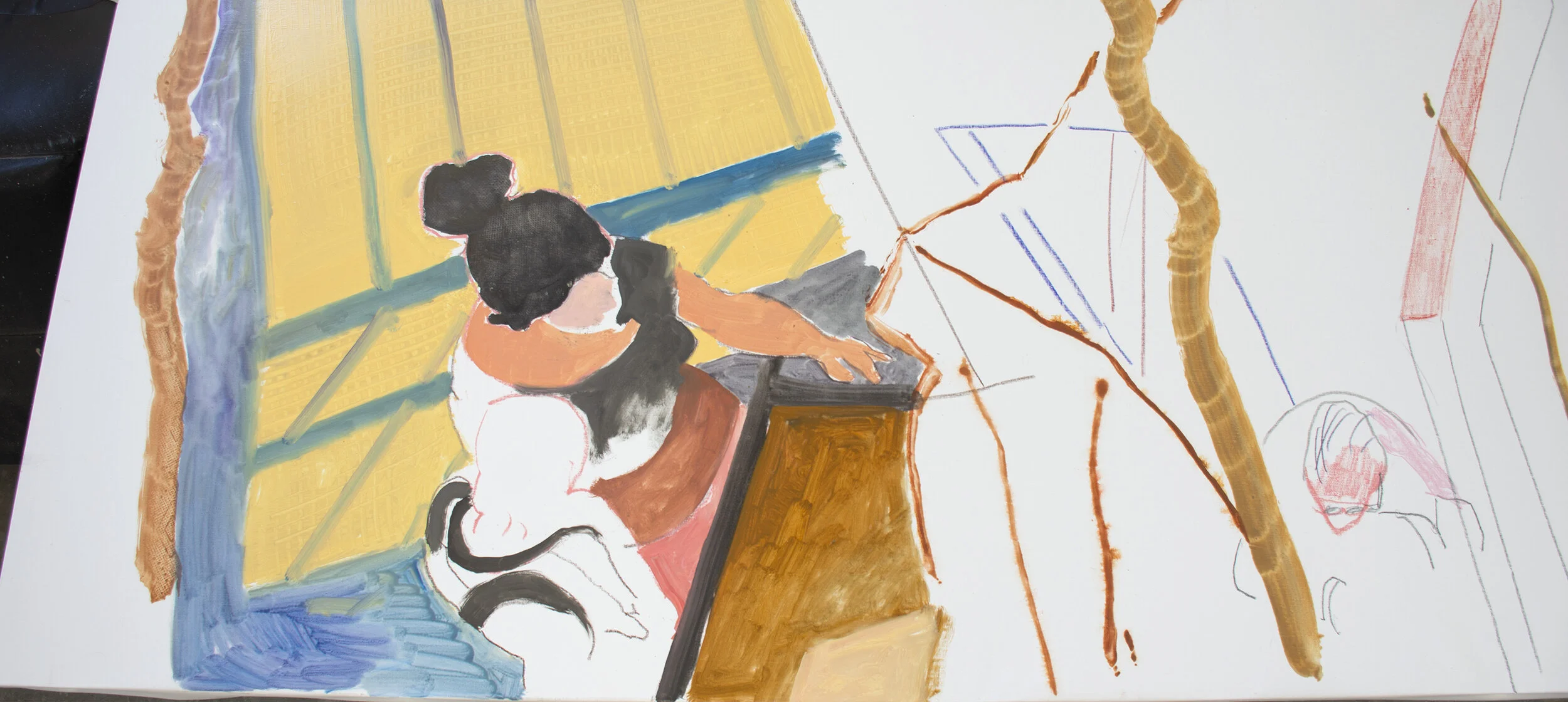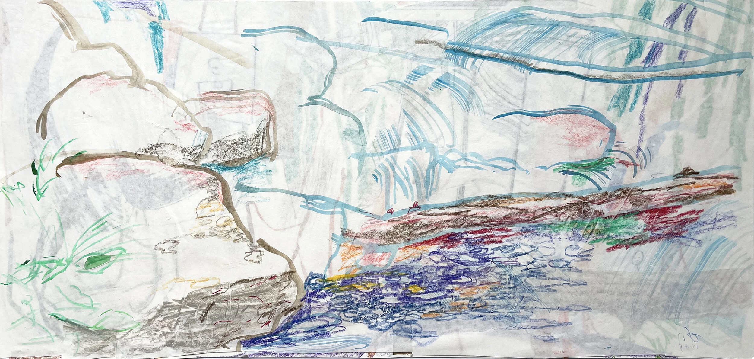 2:43 PM: I took a break from the two watercolor/collages to do some more work on the new 7/4/2021 creek oil, 26 x 78 in., on stretched quadruple primed french linen