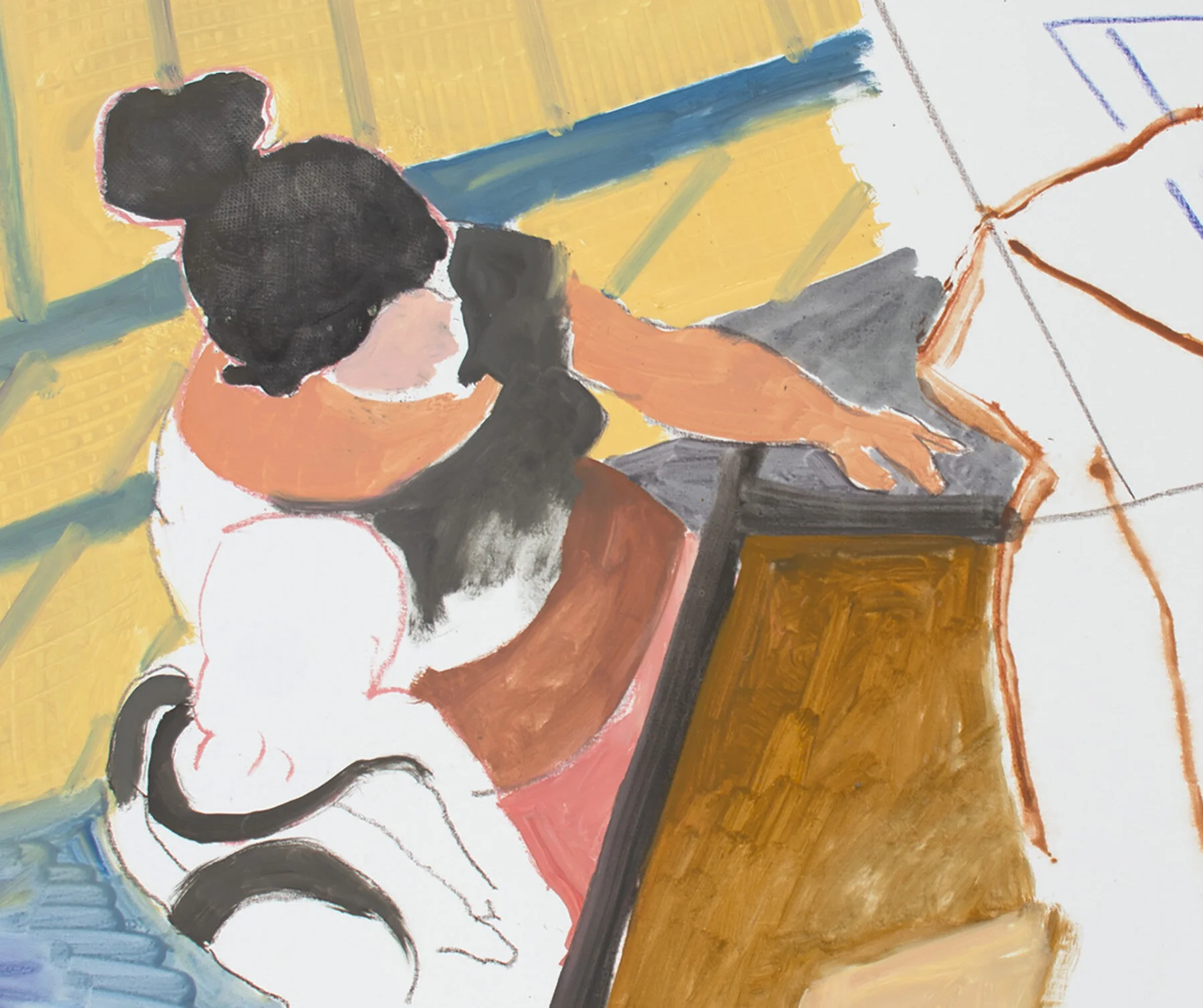 3:22 PM: this is a shot of the left 1/4 of the painting, which i’ve been working/playing on for the past few hours. ABOVE is a shot of the left 1/4 of the entire composition, which is still in process. these two figures are taken form a photo I shot of an opening last year at the gallery representing my work in denver: space gallery. more figures viewed from above will enter the composition and integrate with aspects of the creek-scape. I know not how, as yet.