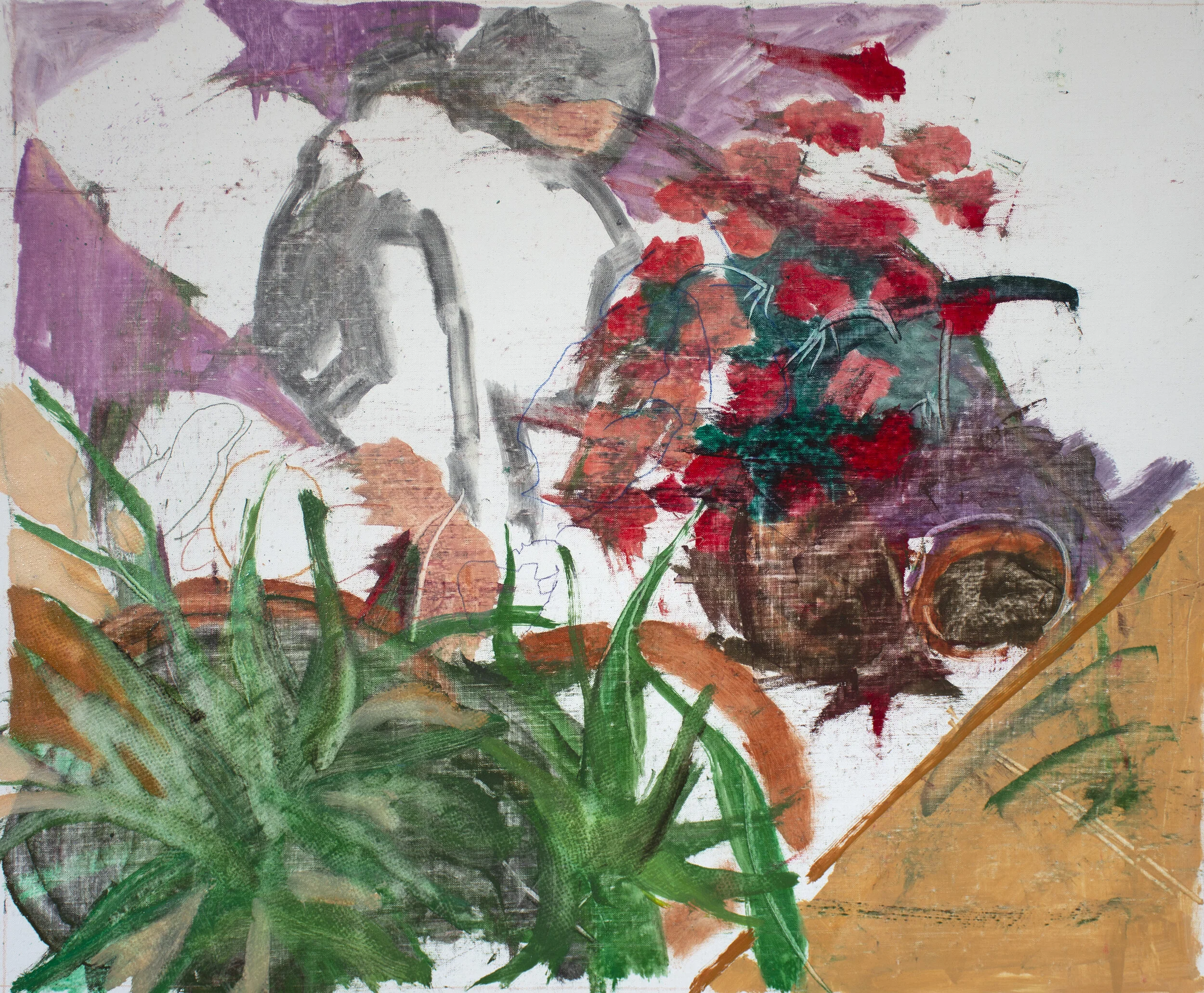 4:17 PM: after re-stretching 7/4/2021 creek oil, I launched into the new watering the flowers oil on linen, 21x25in. it’s inspired by some photos I shot from our upper floor looking down on our entryway, of mikela watering a pot of flowers, which no longer exist. as you can see, I scraped over it, creating some unexpected marks that liven up the composition. i’ll continue working on it tomorrow morning, when I may start a second one to work on in tandem.