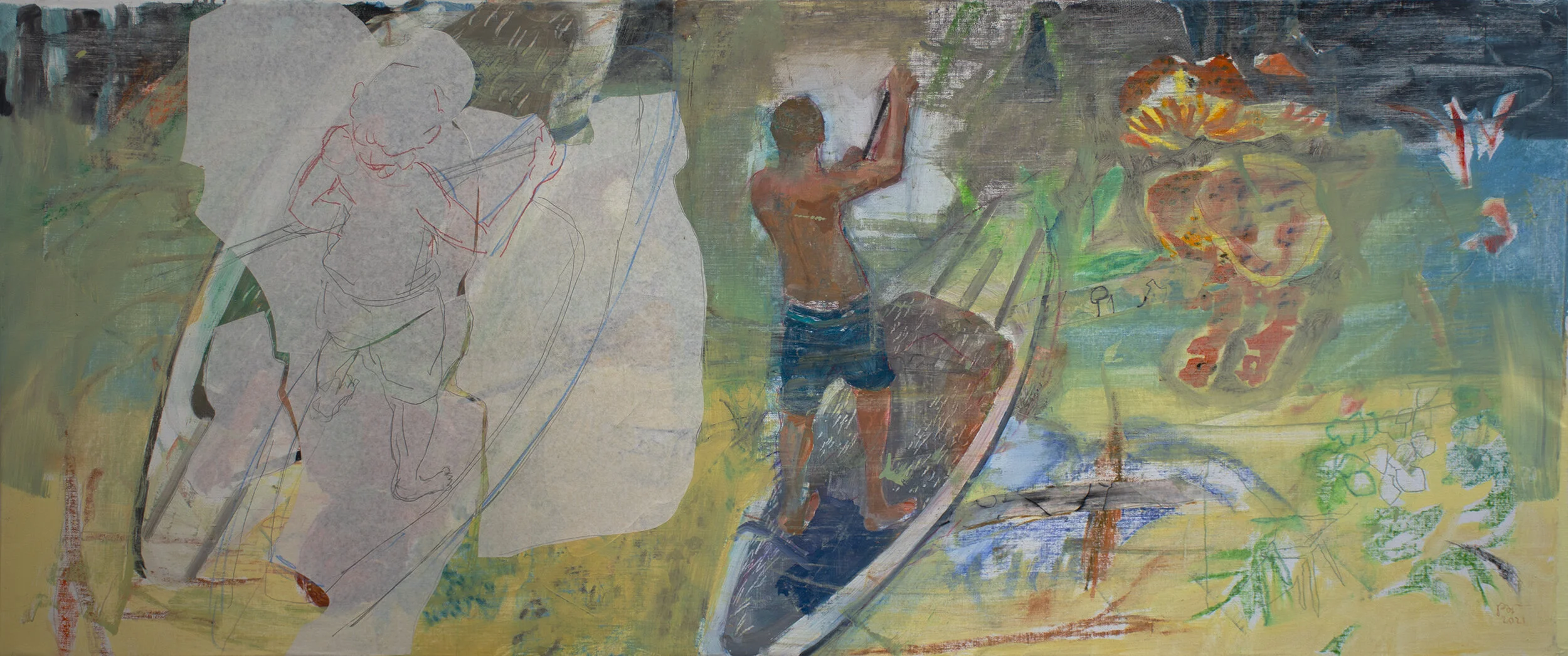 what I did thus far is already making a big difference, and the painting works better already, even though it’s still just off-white paper with a scant drawing of the second paddling figure. but I have to be in my morning energy to take it to the next step.