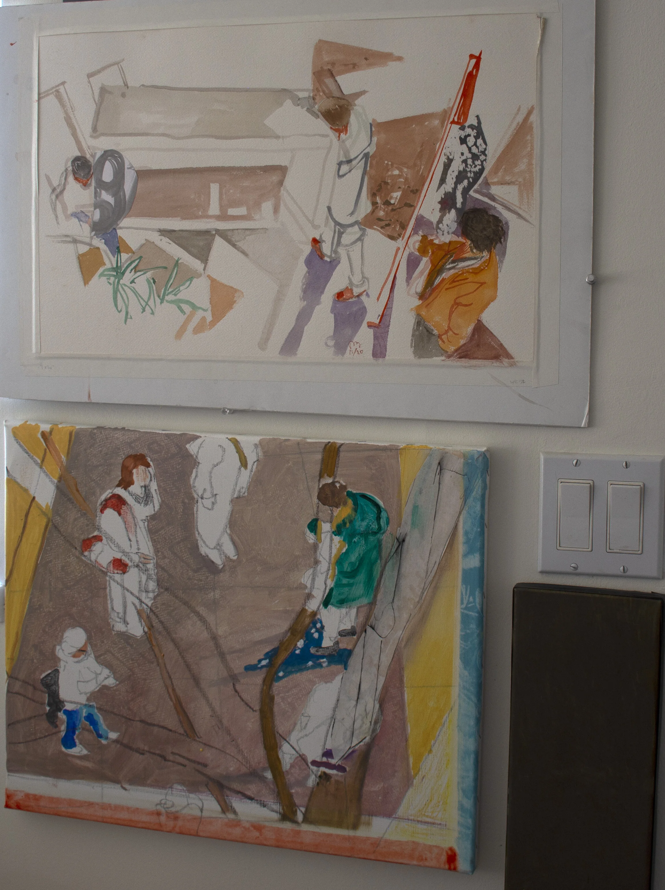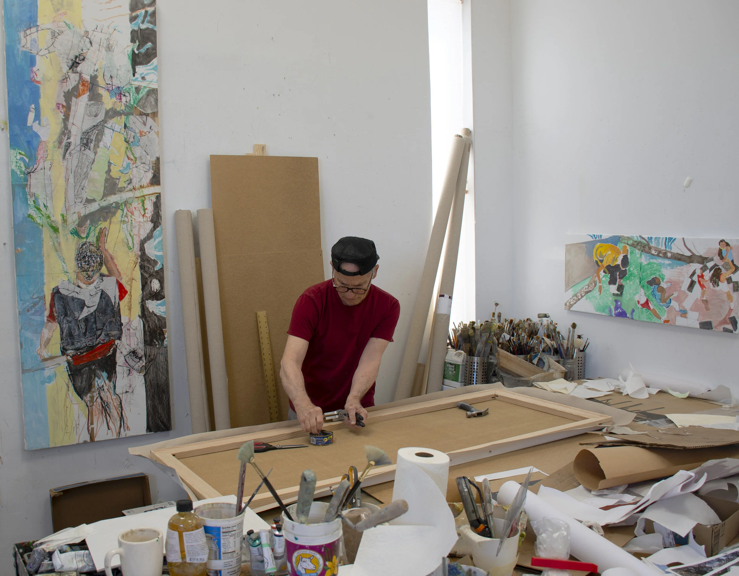 BELOW: left to right: 2 paintings just hung next to my studio entrance; stretching the new canvas; cleaned up bathroom
