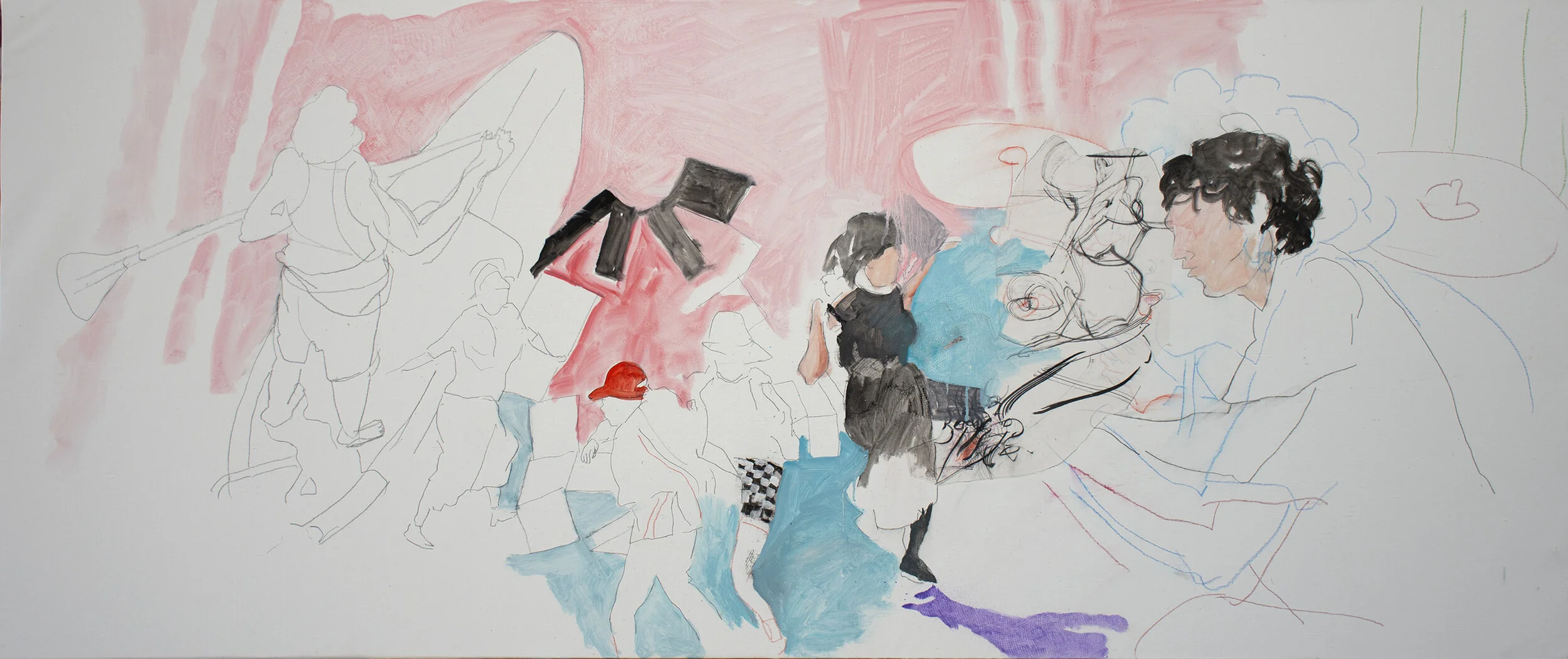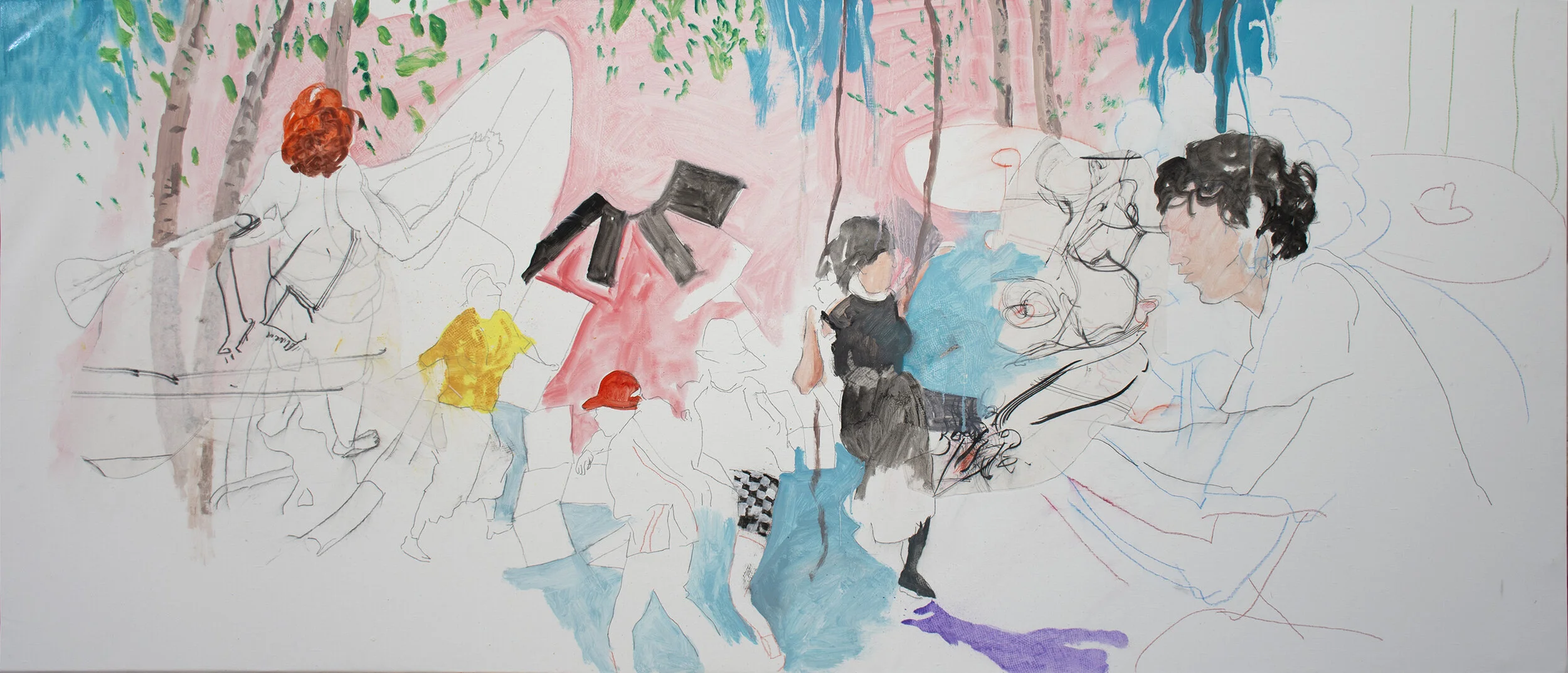 3:24 PM: i’m taking it slow, as you will notice if you check out my 1:18 pm post. trees & leaves have appeared, as well as aspen trunks; one more collaged piece has been added on top of the red haired paddling figure; a yellow blouse has appeared on the female figure next to him. a lot may happen tomorrow, but I think this one will have a long, winding journey. but i’d like to keep the pinks & blues dominant.