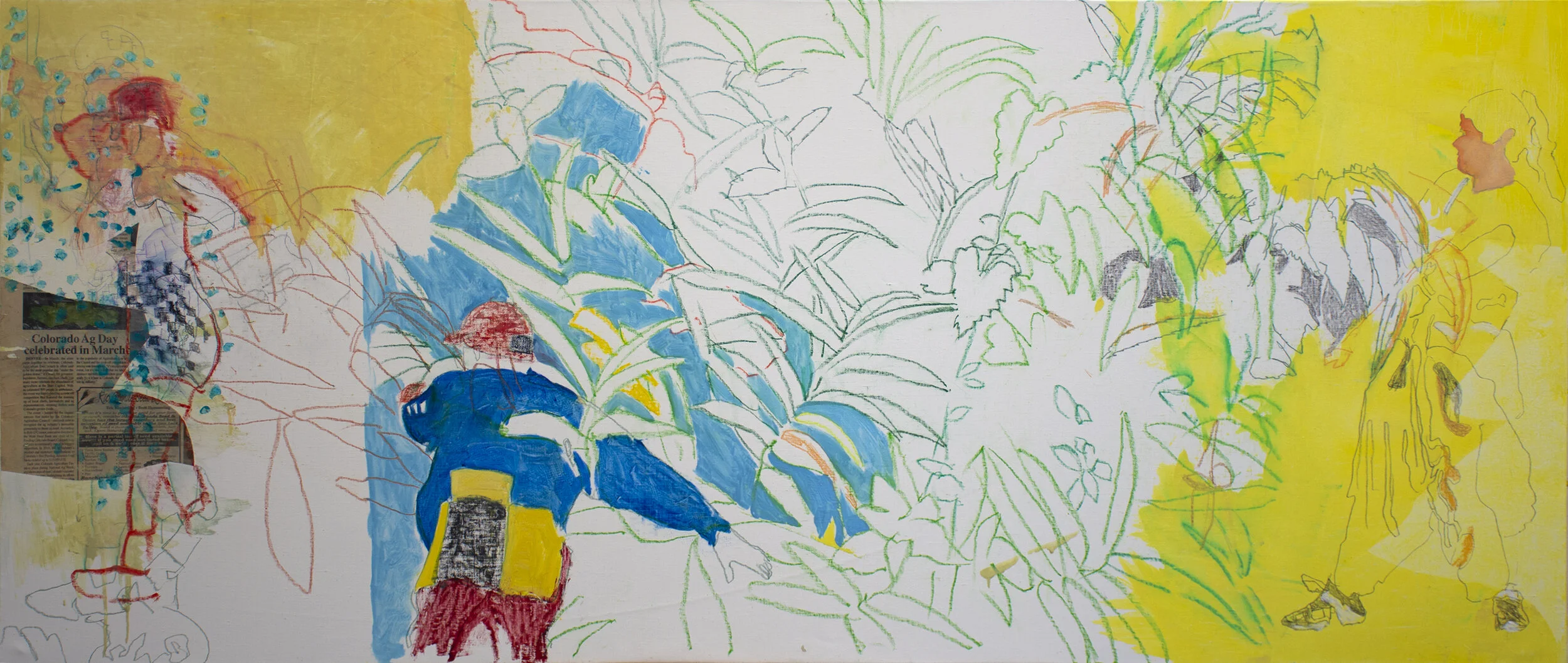 11:51 AM: i’m continuing work on the new painting I started yesterday: 9/4/2021 painting. yellow has entered the picture. the female dancing figure on the left is no longer bare breasted and is covered in blue dots as well as a collaged piece of an old newspaper. green foliage inspired by photos I shot on our trail walk dominate the composition for the moment. as work continues, i’ll post updates.