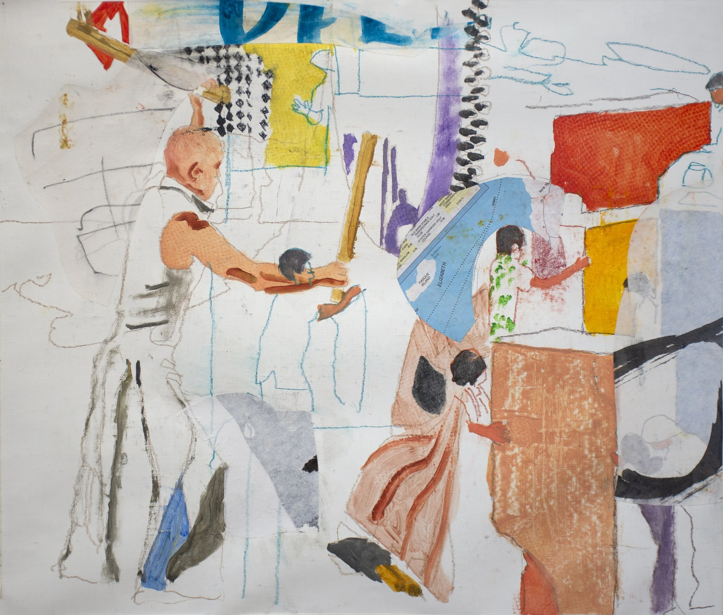 if you take a look at the images BELOW of yesterdays version next to what I just did, you may notice that, which todays version is, in a sense more complex compositionally, it is, at the same time, simpler; easier for the eye & mind to absorb, and less literal. so, for example, the patterning surrounding the big drum, which defines the circumference, is now interrupted by a collaged piece of blue map, creating a visual transition from the red to the siena. in general, the predictable rectangular shapes being moved about by the figures have been interrupted and staggered into a syncopated rhythm. an important role in this transformation is played by the blue letters on the upper left. thelonious monk would appreciate what’s going on here..