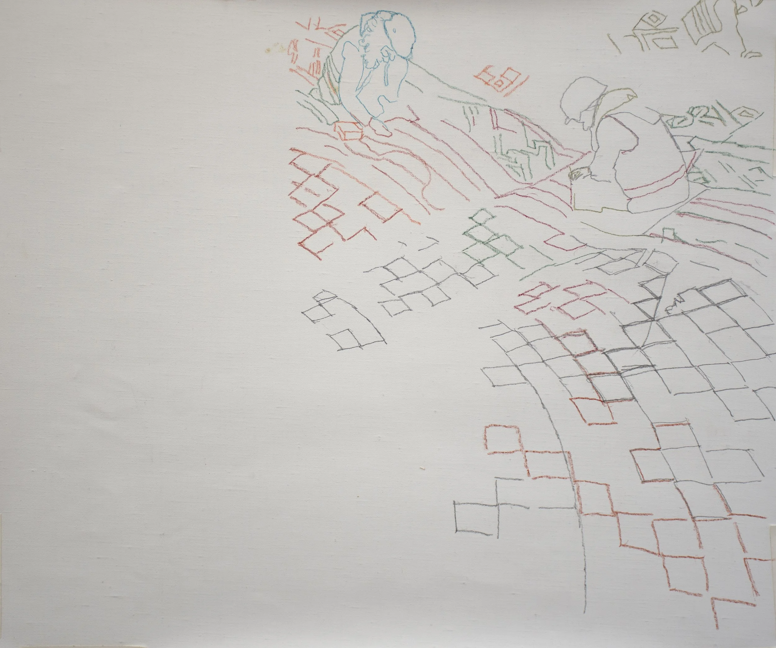 1:35 PM: I started 1/8/2022 polyptych, canvas 5 this afternoon. right now, it’s just a drawing. i’ve been working all morning and my energy just dropped off, so i’ll pick it up again in the morning, here’s the initial drawing. these two guys are working on an ancient mosaic which survived a major earthquake. so the ripple you see is what happened to the mosaic in the earthquake, but aside from that it wasn’t damaged!