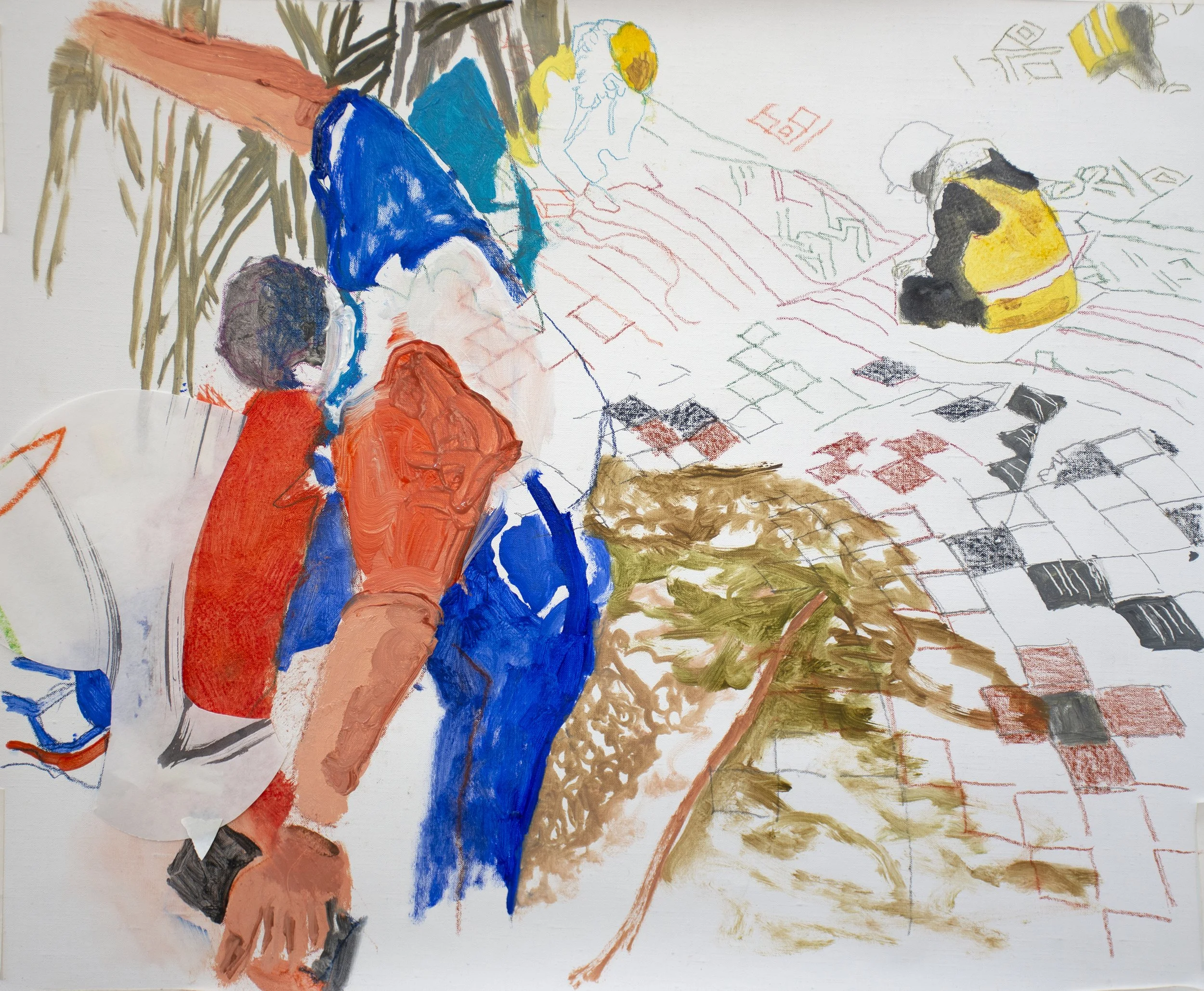2:28 PM: I continued painting 1/8/2022 polyptych, canvas6 today. the main figure thus far is a jumping skateboarder in red & blue. right now, although it may be hard for you to make out, he’s located creek-side. some sketchy trees have appeared above him, with mottled rock formations to his right. on the right side of the composition sit two workmen, who have appeared in previous paintings, restoring an ancient mosaic damaged by an earthquake.