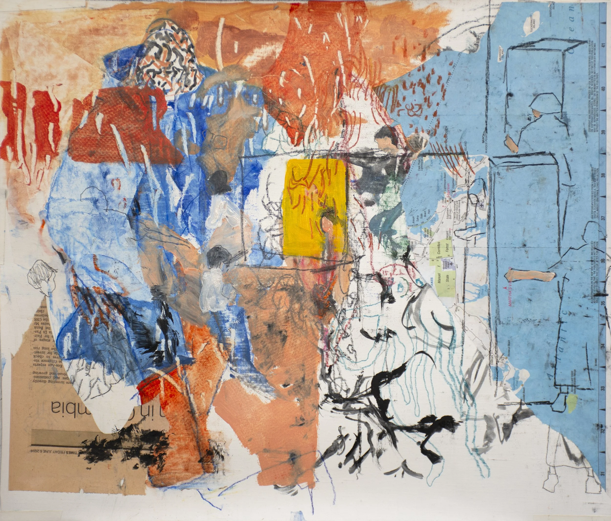 2:39 PM: today I began 1/8/2022 polyptych, canvas 7. right now as I look at it, I can’t tell whether it’s more complex & interesting than it’s siblings, or just too much. looking at it from afar right now is a bit like looking at a colorful map, and indeed there is a piece of map collaged on the right. unlike the others in this suite of 12 paintings (5 more to go) it has no central human presence. it did start out that way, with the figure of a skateboarder on the left, but now it reads more like an abstraction, give it till tomorrow morning, and we’ll see if and how it evolves.