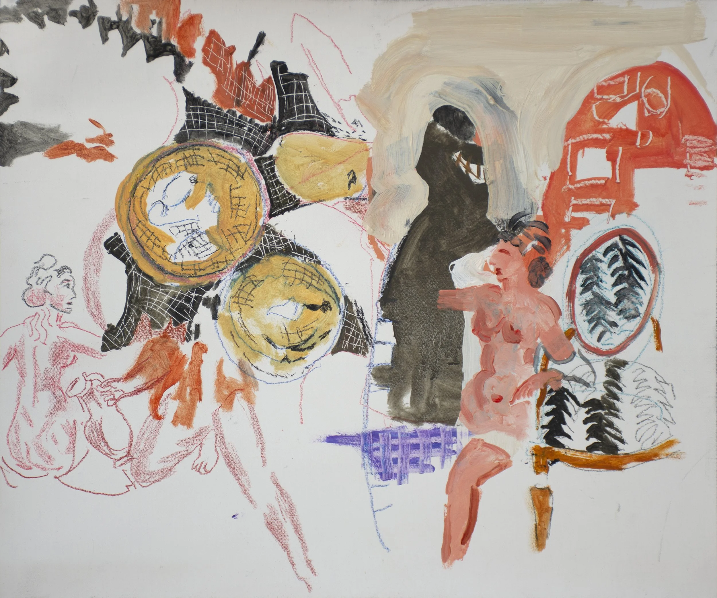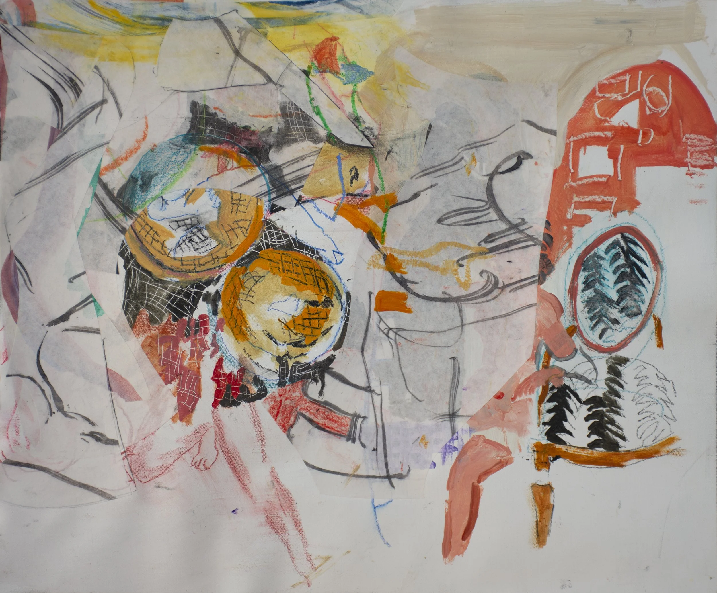 3:37 PM: a bit more work on canvas 12 in this suite of 12 canvases. I think the yellow, red & blue additions on the top portion of the composition have helped enormously, as does the deeper red beneath the two spheres, in the center of the composition. you can see the collaged elements that are bits of the cut up ink drawings I made yesterday morning. this is the only one of the 12 that does not have obvious human figures, although if you look carefully, you will discern a few legs towards the bottom as well as a shoulder and hand towards the right, next to the chair. if you had this hanging in your home, I venture to say you would never tire of looking at it, always finding something new..