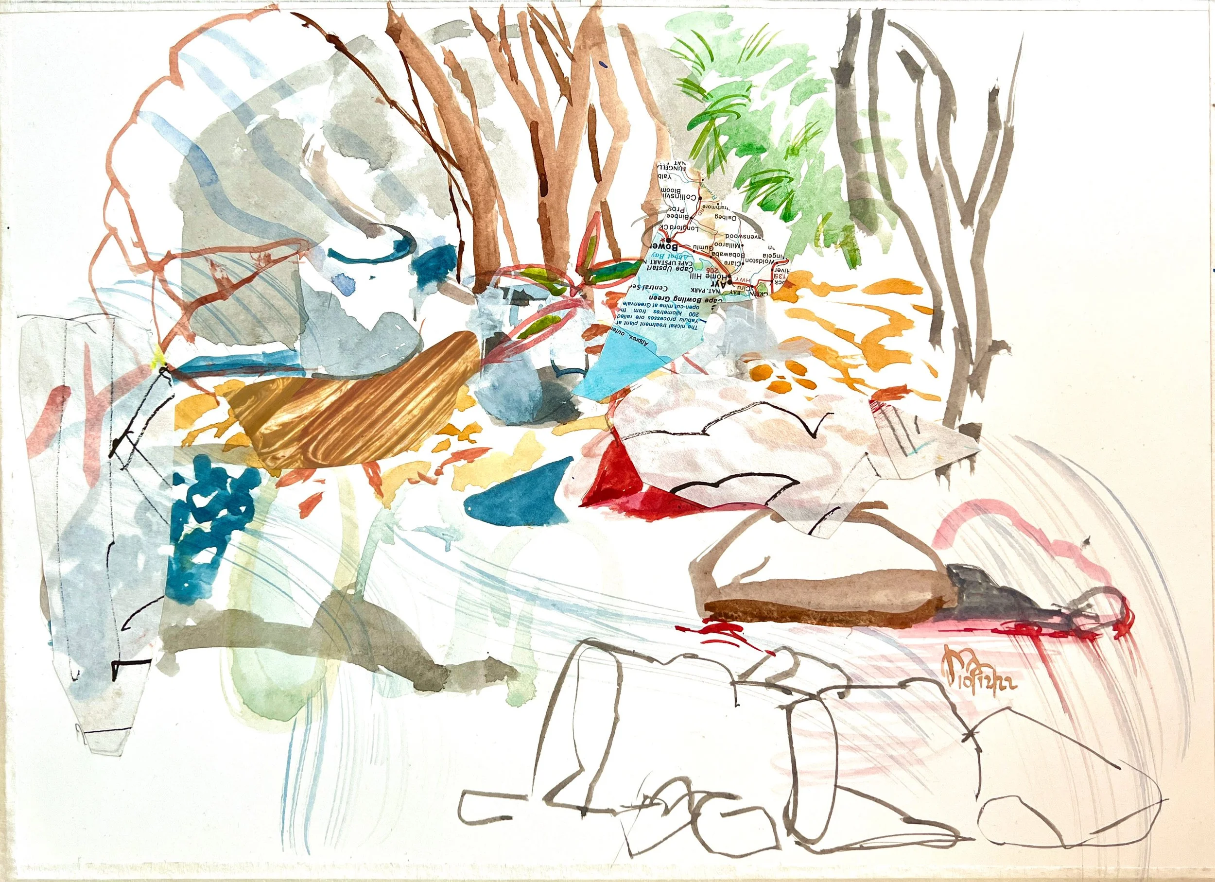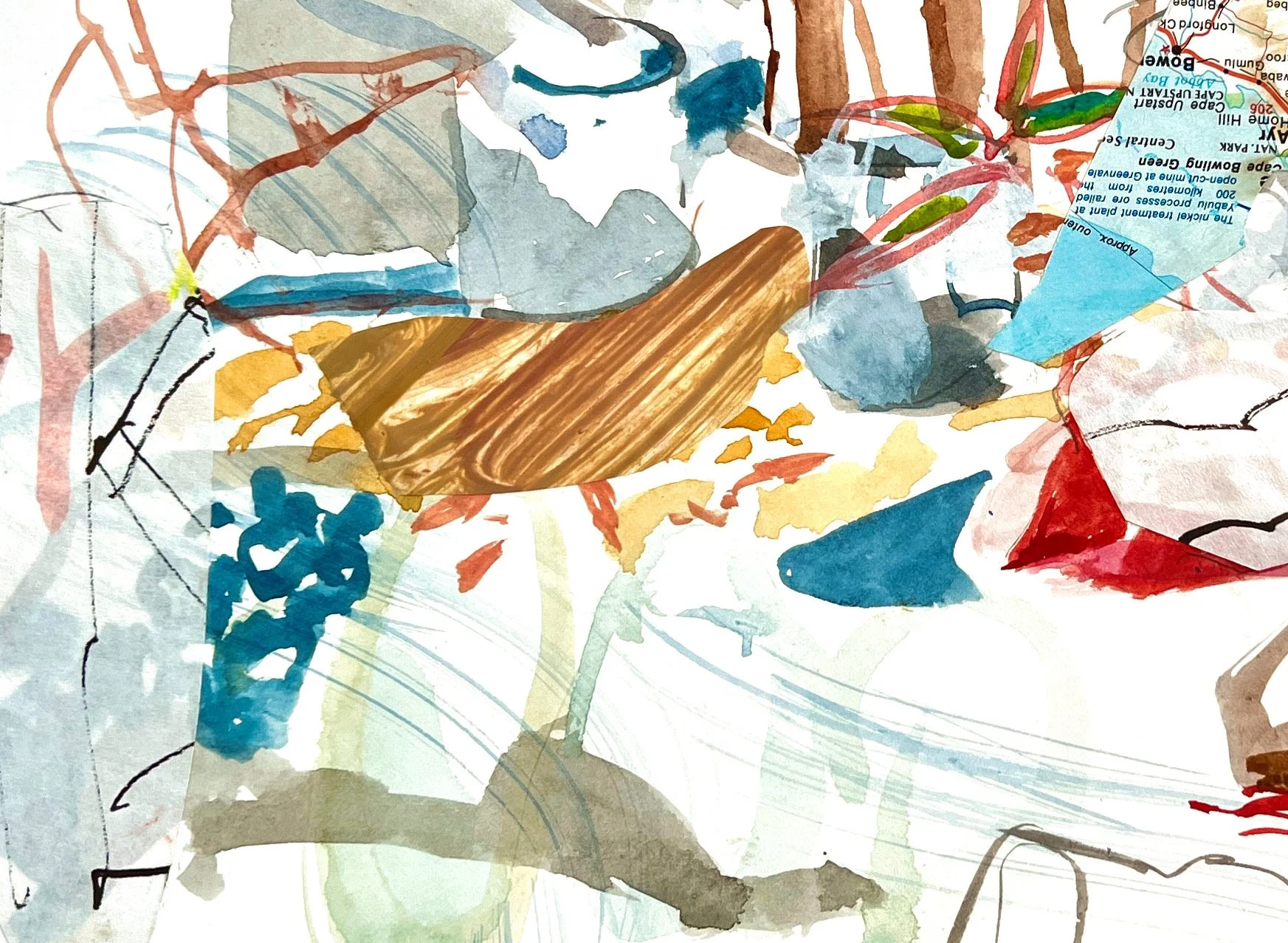 these watercolors, by the very nature of the medium, happen rather quickly. i do, by the way, use a little white tempera to create some subtle greys & paint over not so successful passages. what is becoming a series of watercolors now has some added collaged elements, which happened when i got back to the studio.