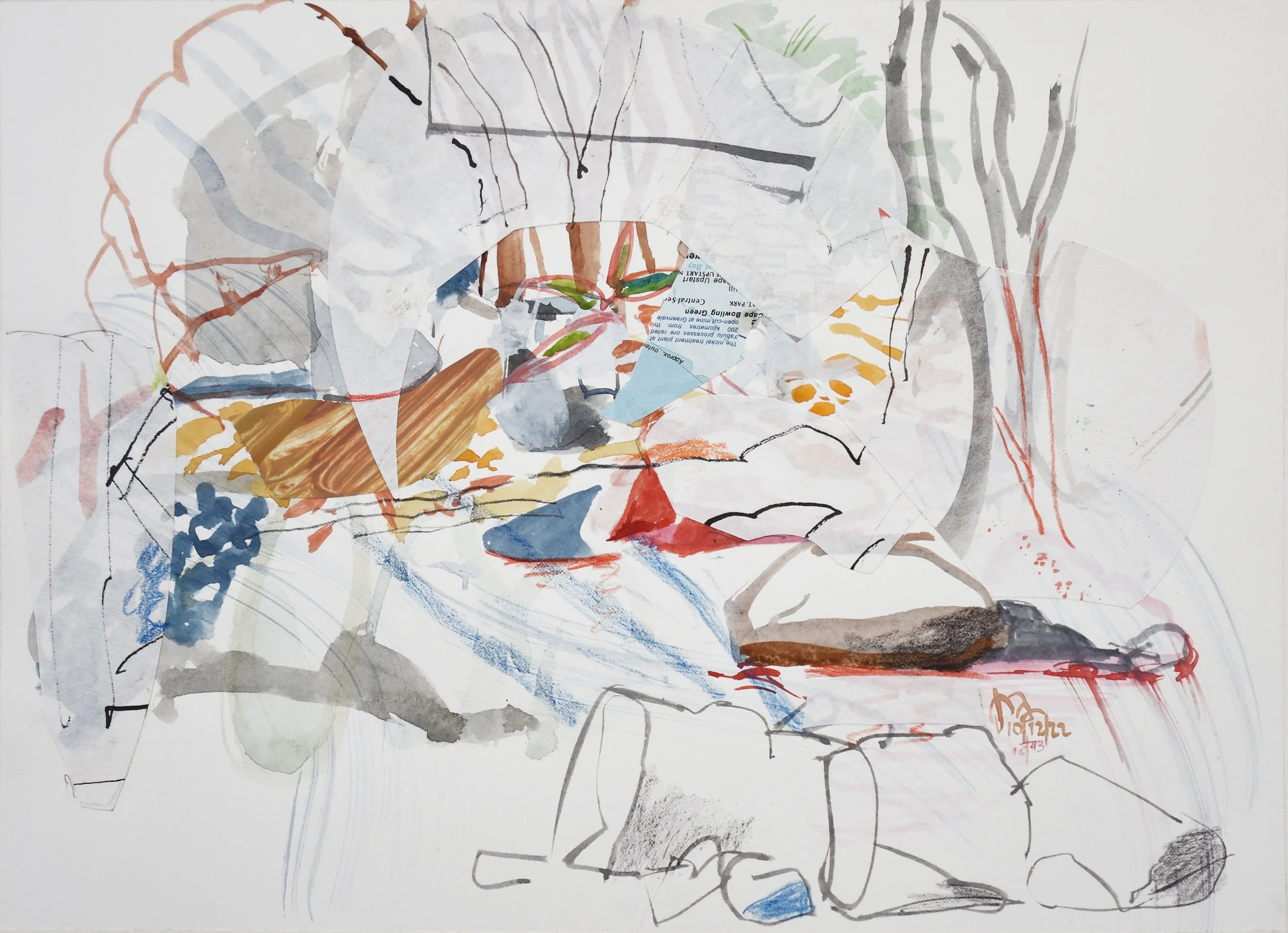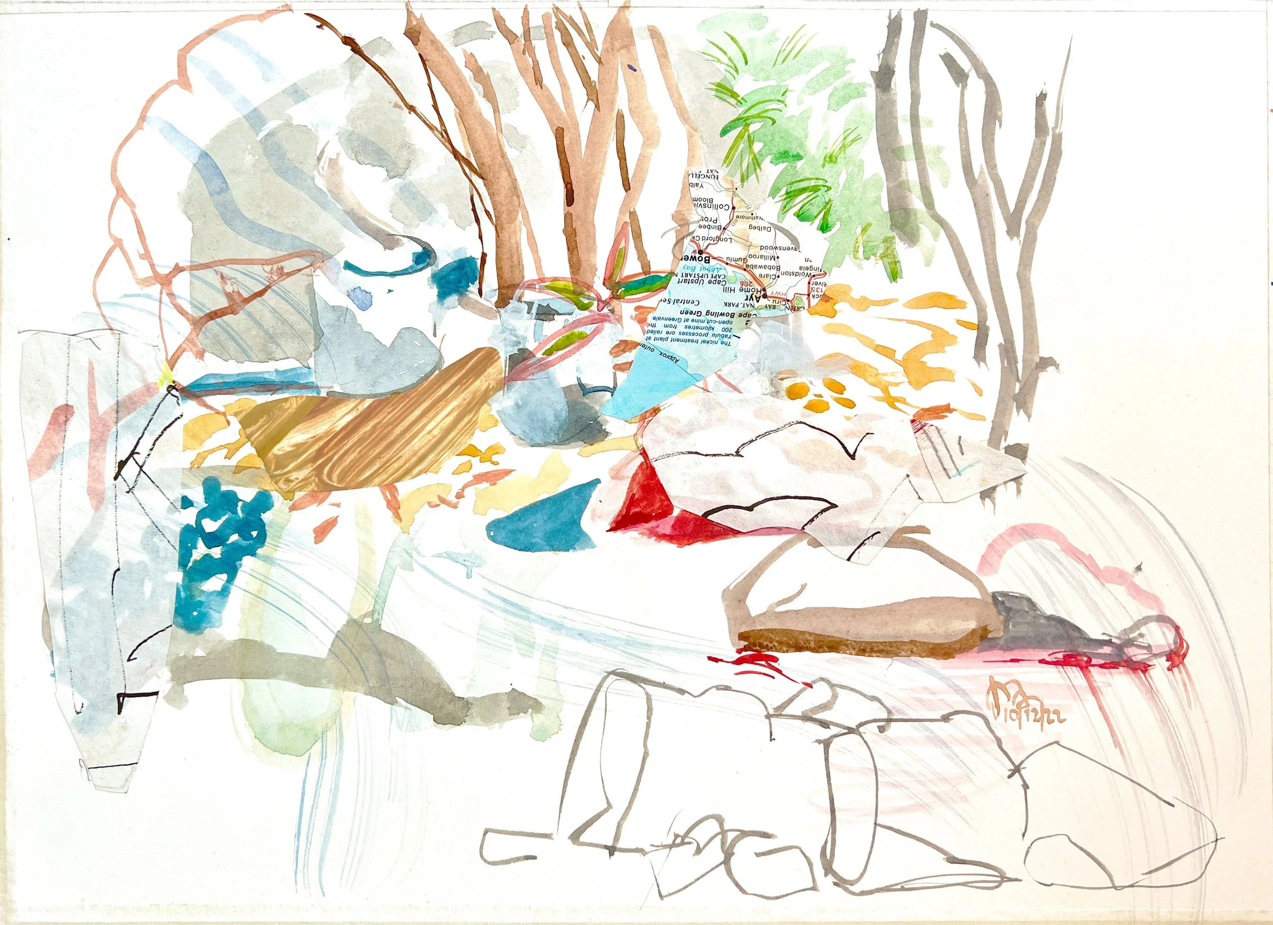 11:34 AM: the watercolor/collage i made yesterday afternoon at the creek was asking for more. so, naturally, i followed instructions. i ended up doing quite a bit, including more collage and marks using colored pencils.