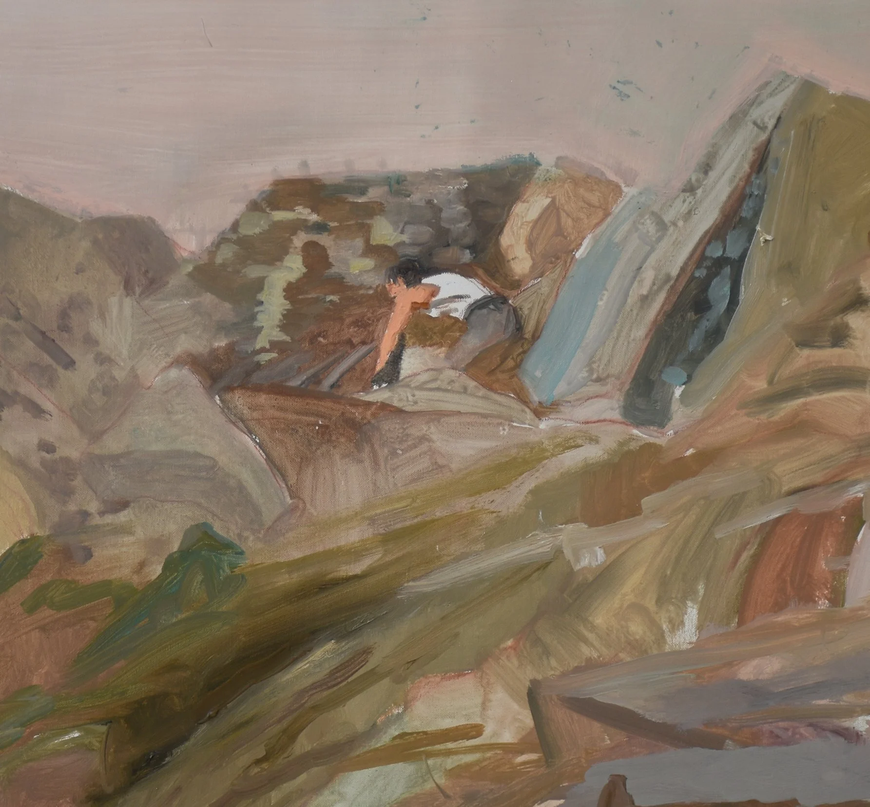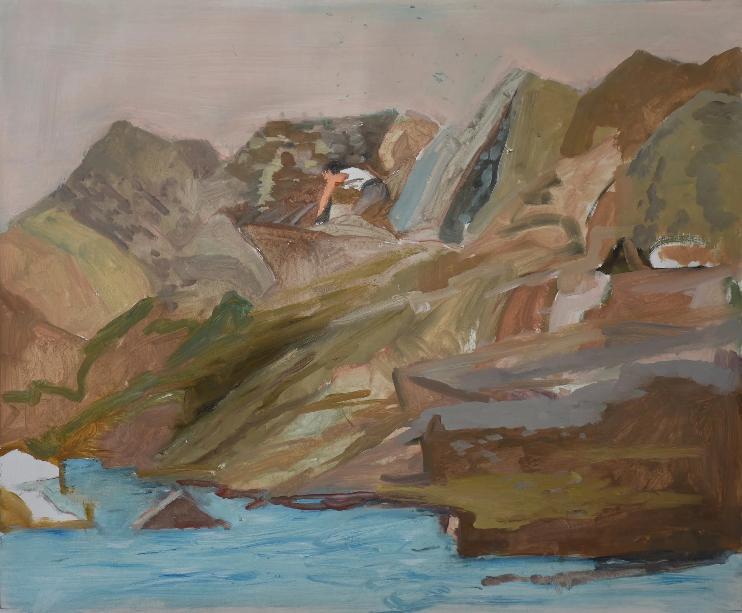 2:13 PM: i had a rocky start to the day, when i thought i had lost my wallet. after frantically searching the house & studio, i found it on the cement floor beside the studio bathroom toilet, where it had dropped yesterday afternoon. i was so shaken up that i didn’t think i could paint. but man on rocks drew me back in & before you know it, i was at work, making some significant simplifications and modifications, for the better i believe.