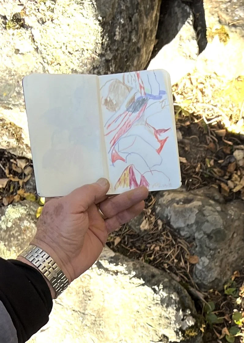 and then this afternoon, we took our walk up the trail & stopped at my favorite spot to make quick plein air drawings, overlooking the creek.