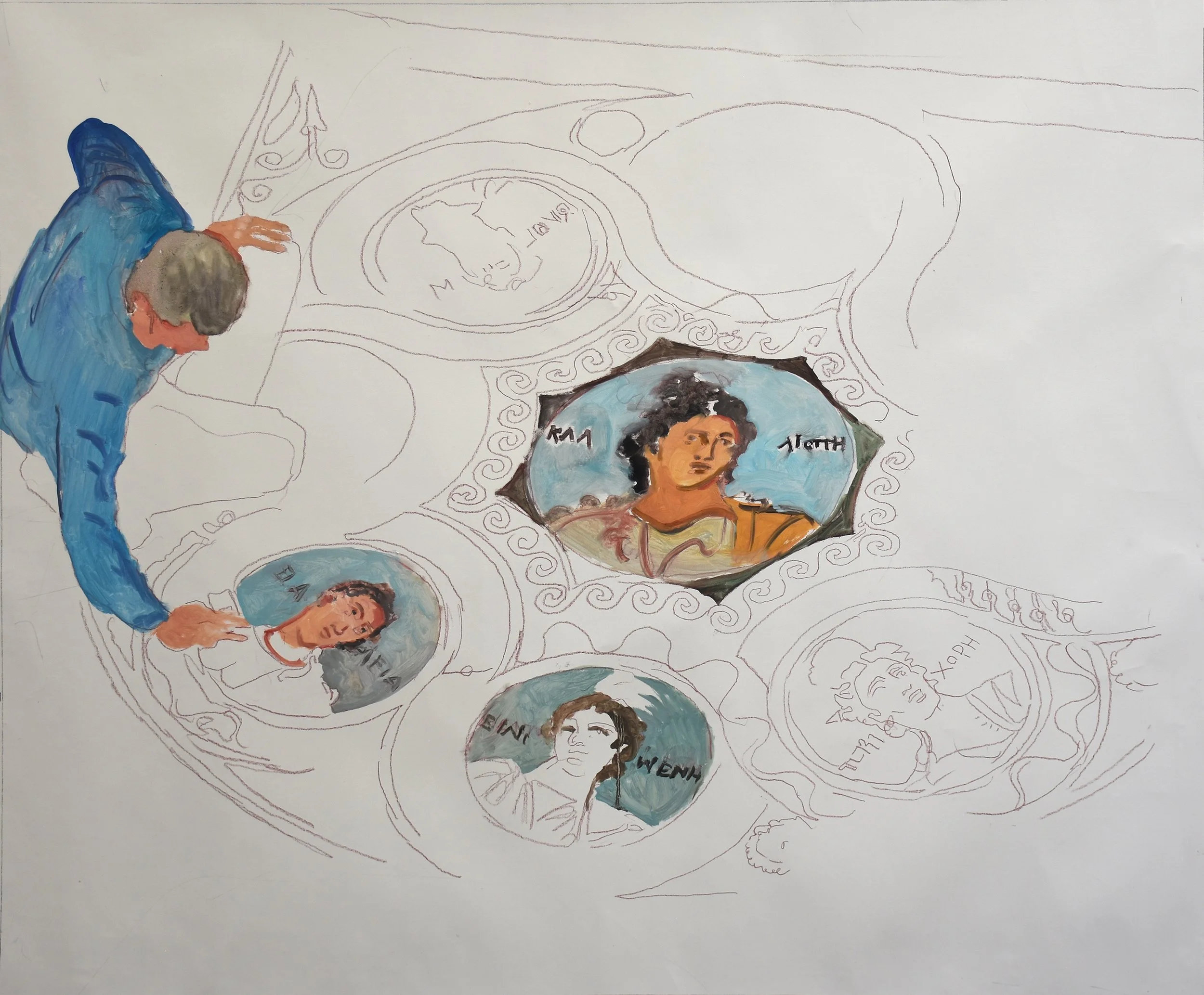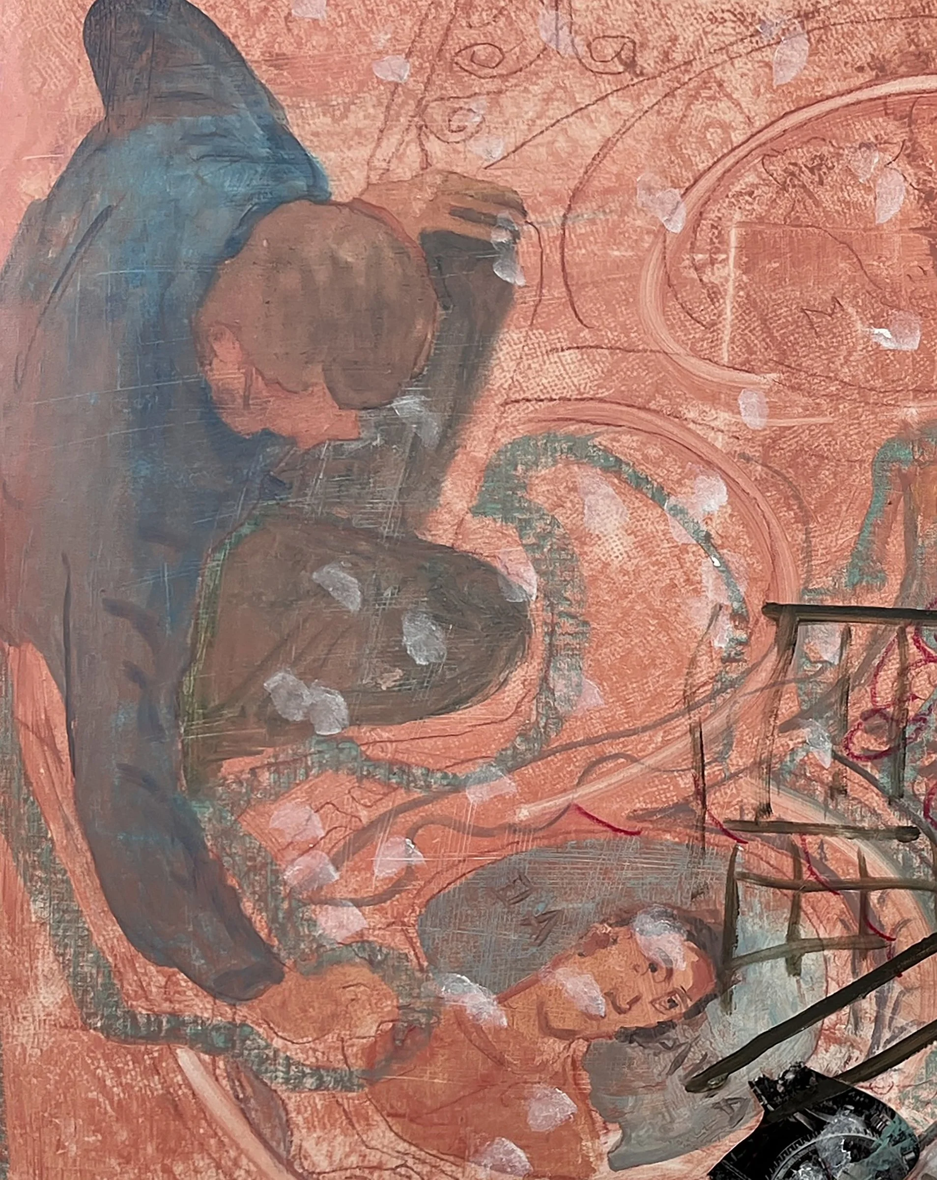the underlying painting, which you can see on days 1 & 2, was inspired by an ancient roman/grek mosaic seen from above & being restored by the figure on the left. that was painted over with a pink-ish color. then the image of a byzantine church in central athens, surrounded by blue sky began to appear. that was painted over whit titanium/zinc white, then scraped into & blotted over this morning, then flipped 180° so that the church roof looks kind of like a flower pot.