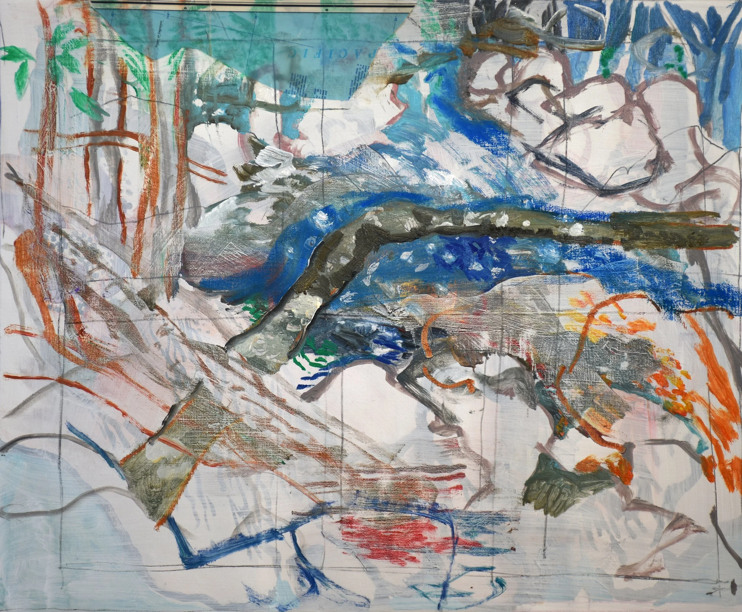 by the way, the bit of blue sky on the upper left is a collaged bit of a map. i’ve had difficulty collaging paper onto still wet (or dry for that matter) oil paint, so today i tried something new, using my neo megilp oil painting medium. it’ll take a while to fully dry,and we’ll see if it works in a few days or so.
