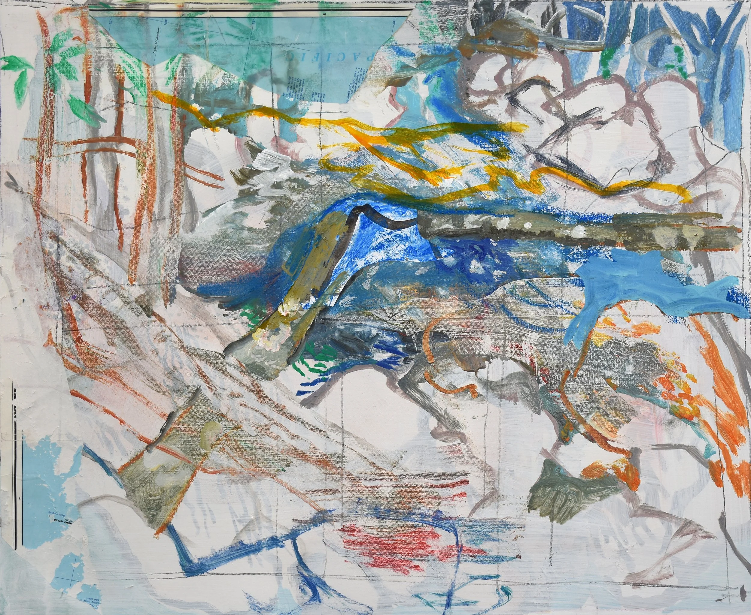 i was able to break up the horizontal branch in the earlier version, which was too dominant and didn’t allow the rest of the composition to sing, by collaging a piece of a gestural reed pen ink drawing. i also broke up the creek water beneath the branch, both in form and color. that did work, but it still needs some adjustment.