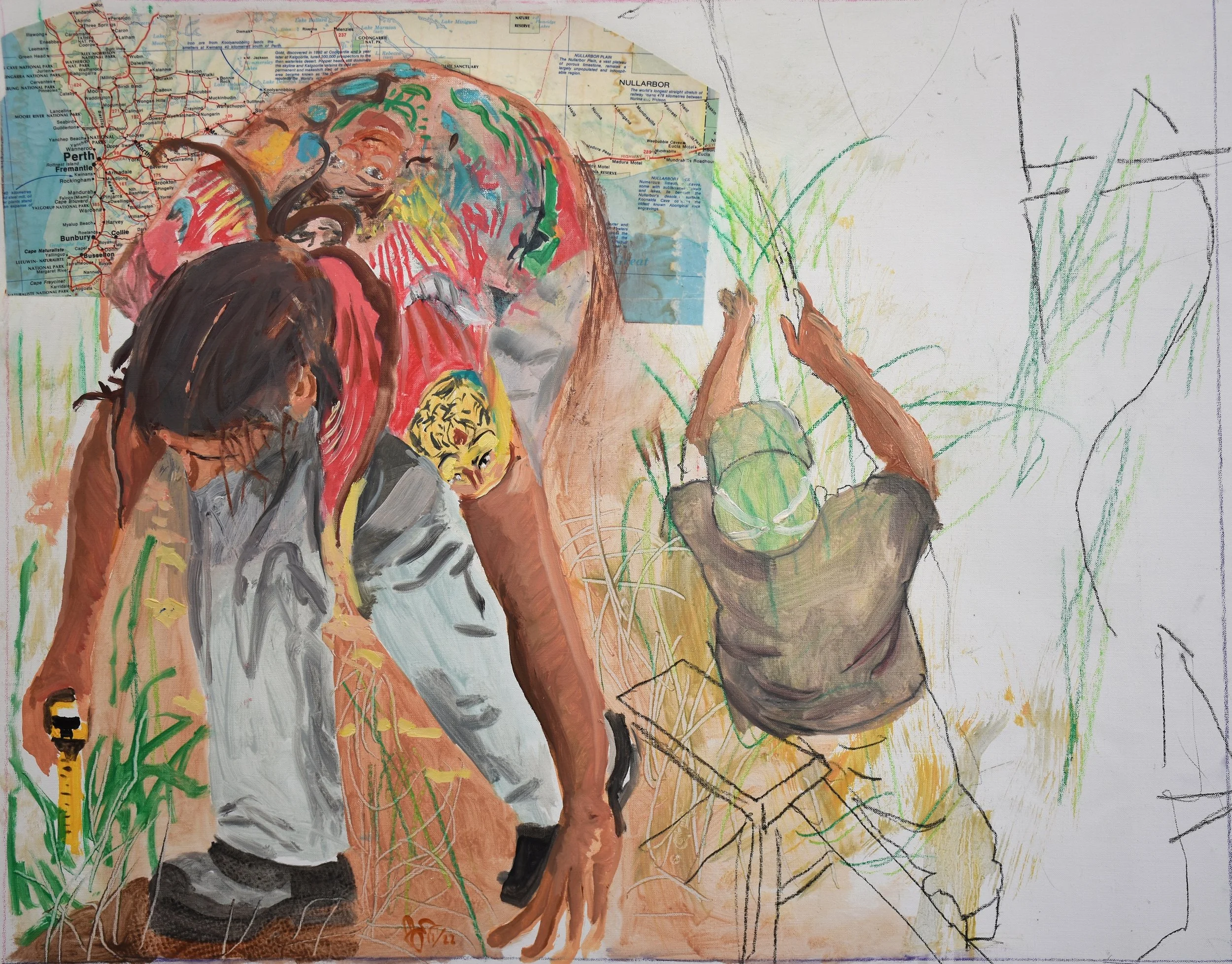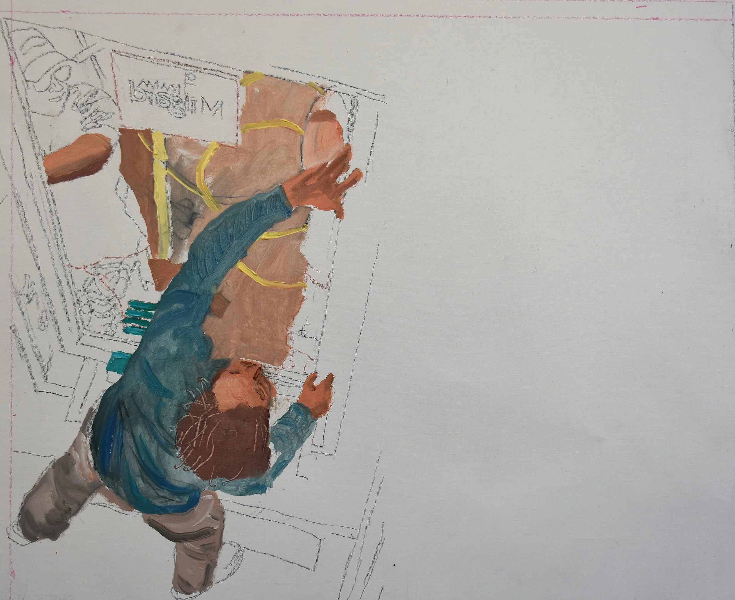 gazing at it from about 20 ft. here in the studio, it works compositionally and coloristicly. the subject matter, while compelling, does not dominate, and the interplay between the two figures is critical. without the obvious clue you get from the title, you would guess that these are 2 guys doing some sort of construction work. more importantly for me, you would experience it as a playful abstraction containting painterly marks, with a touch of the enigmatic….enough to draw you back in again and again.