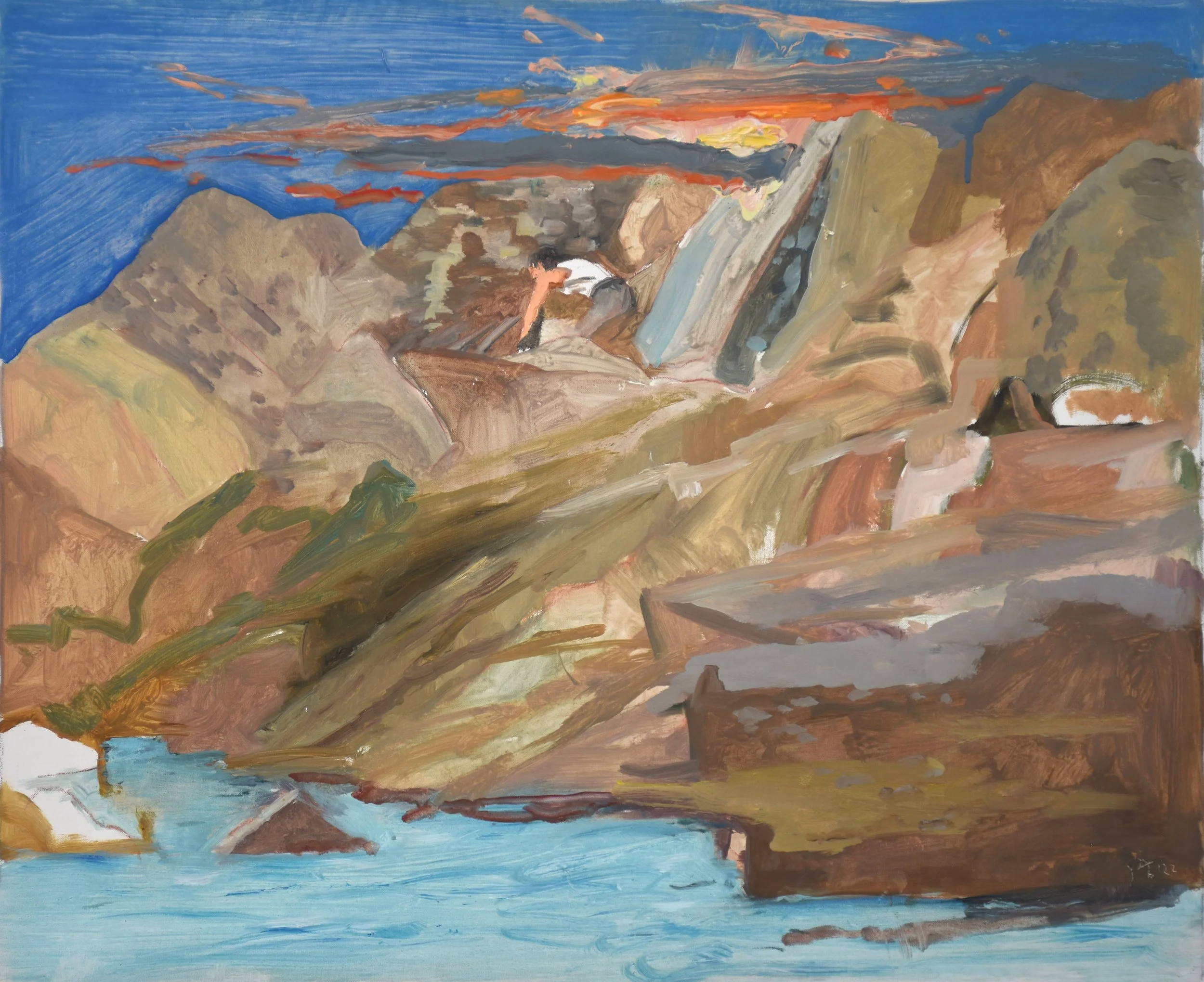 today, not satisfied with the sky, i came back to it. and when i did, i realized that the title man on rocks doesn’t do it justice. it’s me, philip, climbing over those rocks. my former mother-in-law, the late painter niki karagatsi and i made many drawings and paintings here, just 10 minutes from the house. afterwards, we would compare notes. niki was born in andros, so there was no way i could equal her deep feeling for this place, which was so present in her drawings and paintings. but, as a transplanted american who learned quickly to speak and gesture like a greek, i brought my own music to it. so there’s an echo of brooklyn in every stroke. but perhaps even deeper is the music of what i feel are my former lives in this place of magic.