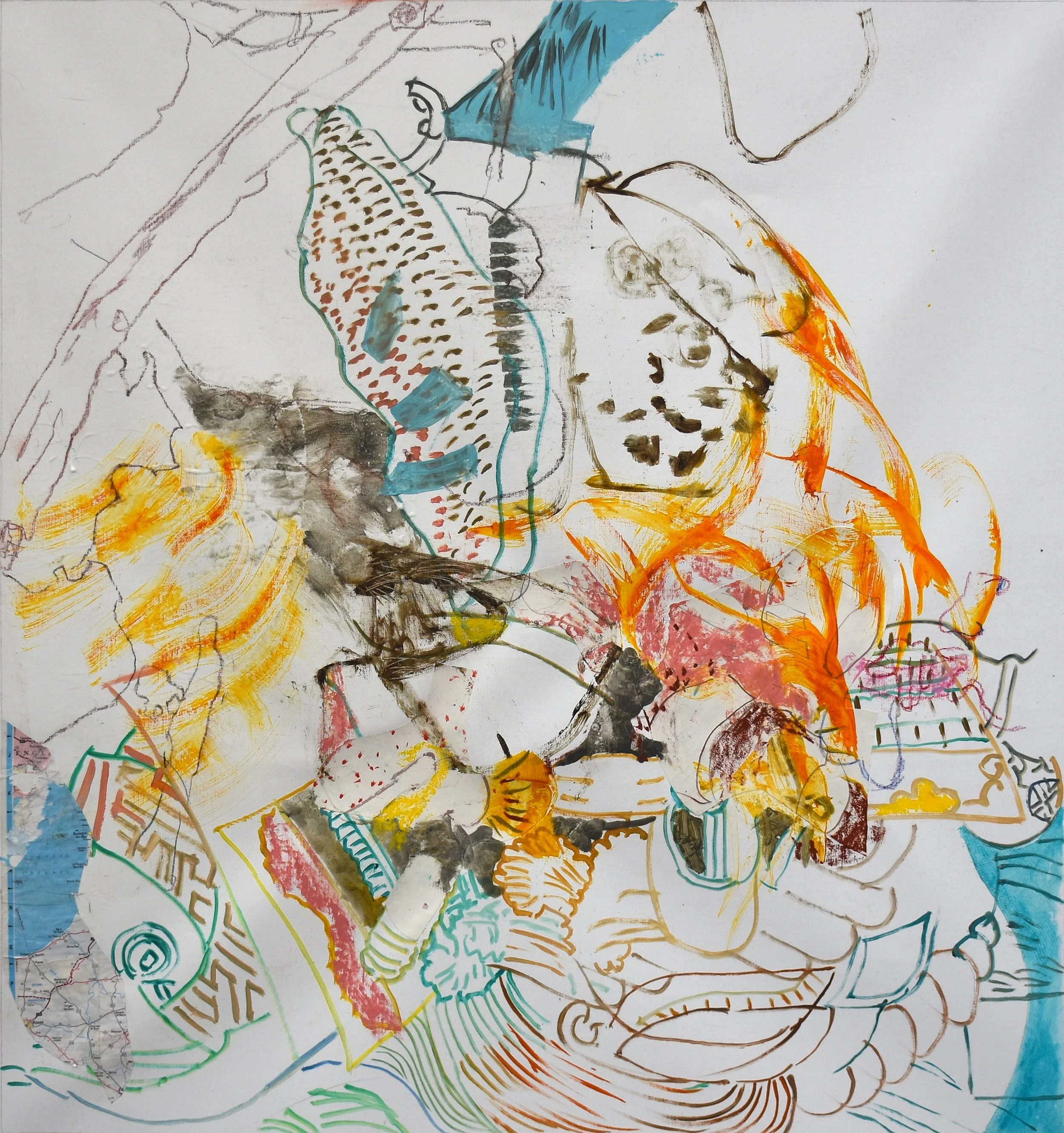 i took the canvas off the wall and worked a bit with it flat on my work table, where i applied a few collaged pieces. it’s very much in the vein of the previous 21x17” paintings i’ve made over the past few weeks, but on a larger scale: 38x35”