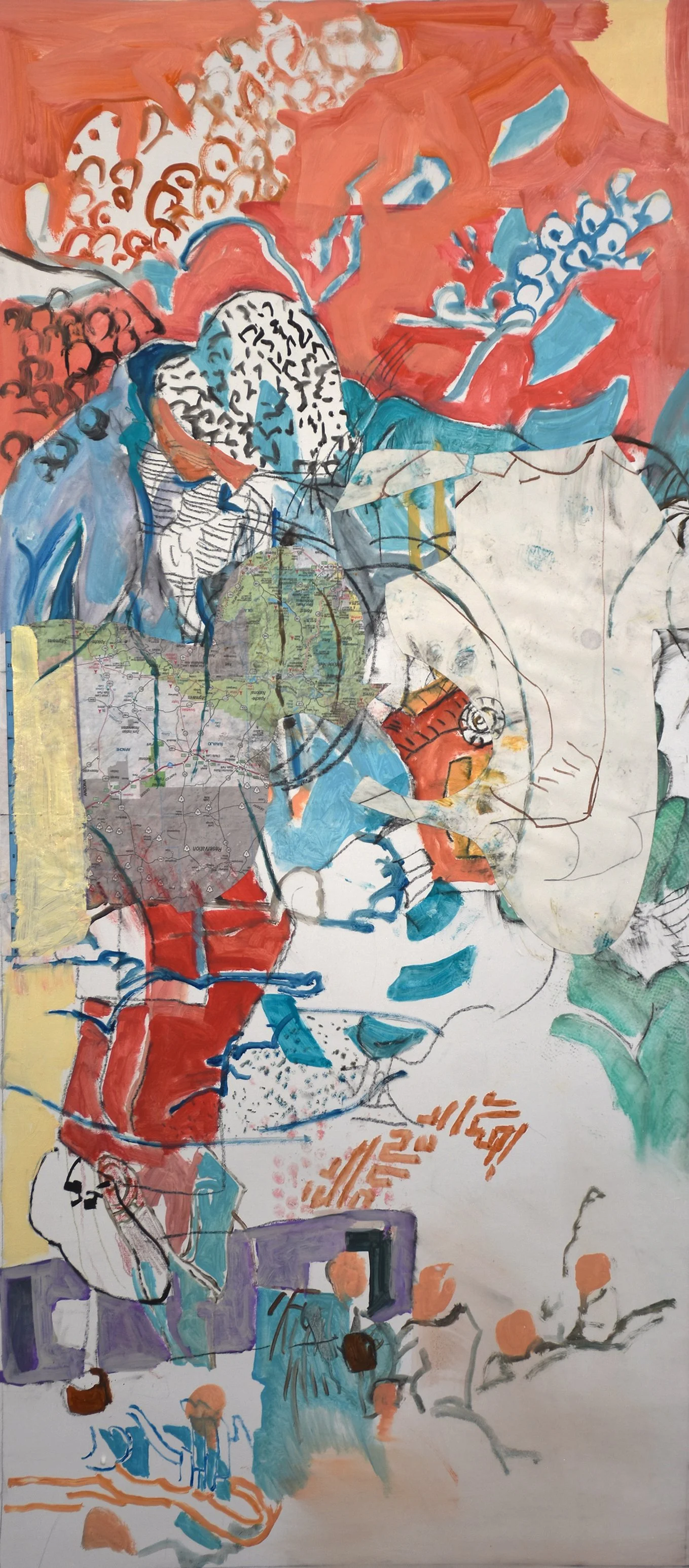 4:15 PM: after lookiing at the painting while posting an hour ago, i decided that the collaged elements were taking away from the coherence of the composition. the adhesive material was still fresh enough tha i was able easily to remove them; so here’s the current state of the painting.