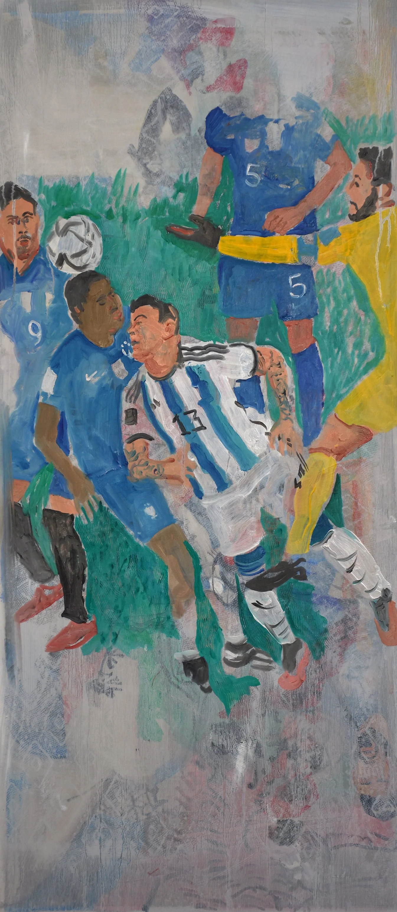 the football players have pretty much integrated into the larger composition, although the one in the center with the blue stripes is still the main form. the vertical brown lines resembling drips, were inspired by the natural vertical markings in the silk that taiga painted on.
