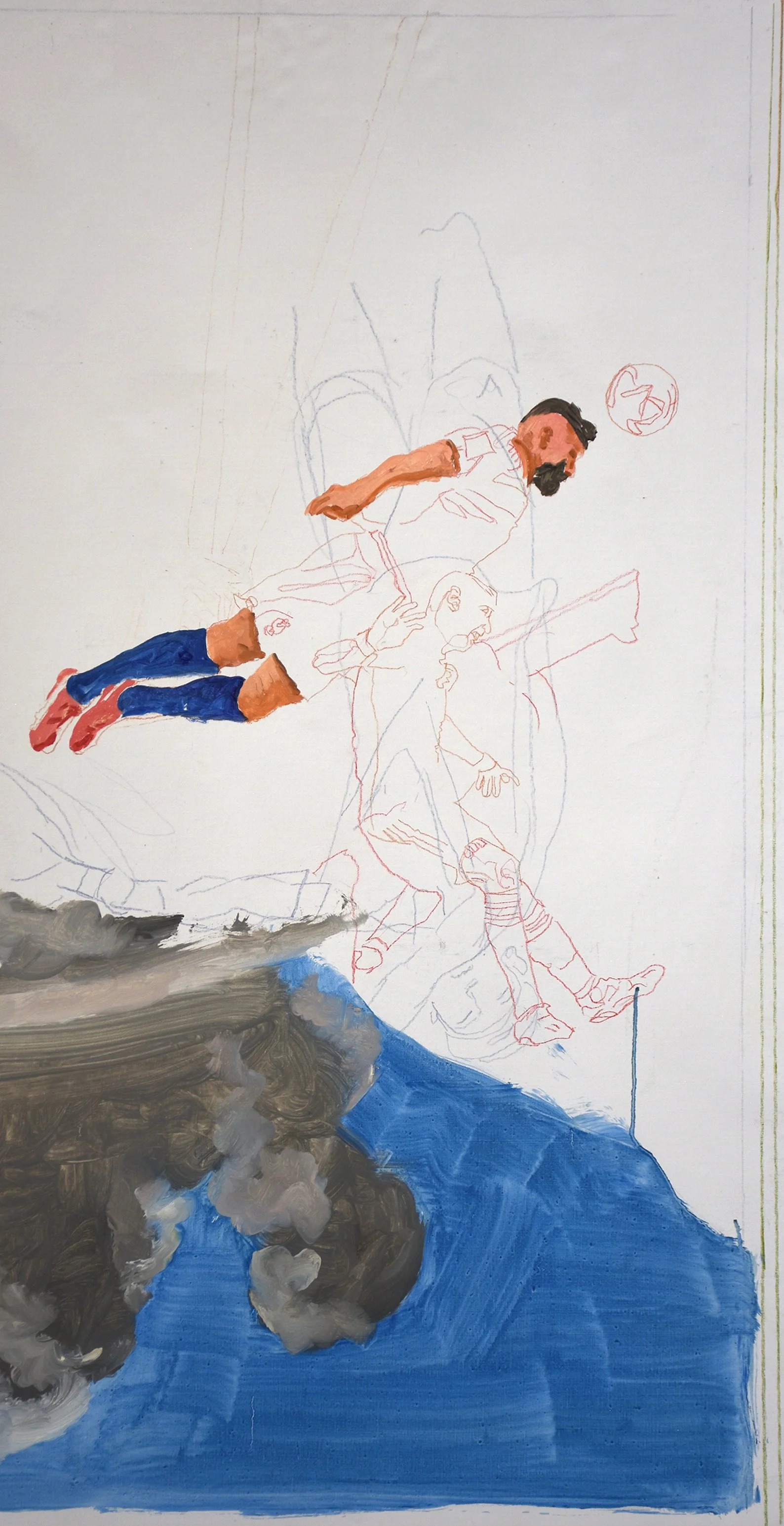 i’m working on a piece of unstretched linen, and the image measures 38x18.” i had started working on this piece of primed portrait linen last month, and then for some reason i stopped, rolle dup the canvas & stuck it in a corner. found it this morning & cut it down to the new dimensions, then flipped it upside down. so now, at this early stage, it appears that this soccer player heading the ball is flying through space, having leapt off what appears to be a rocky cliff overlooking a body of water.