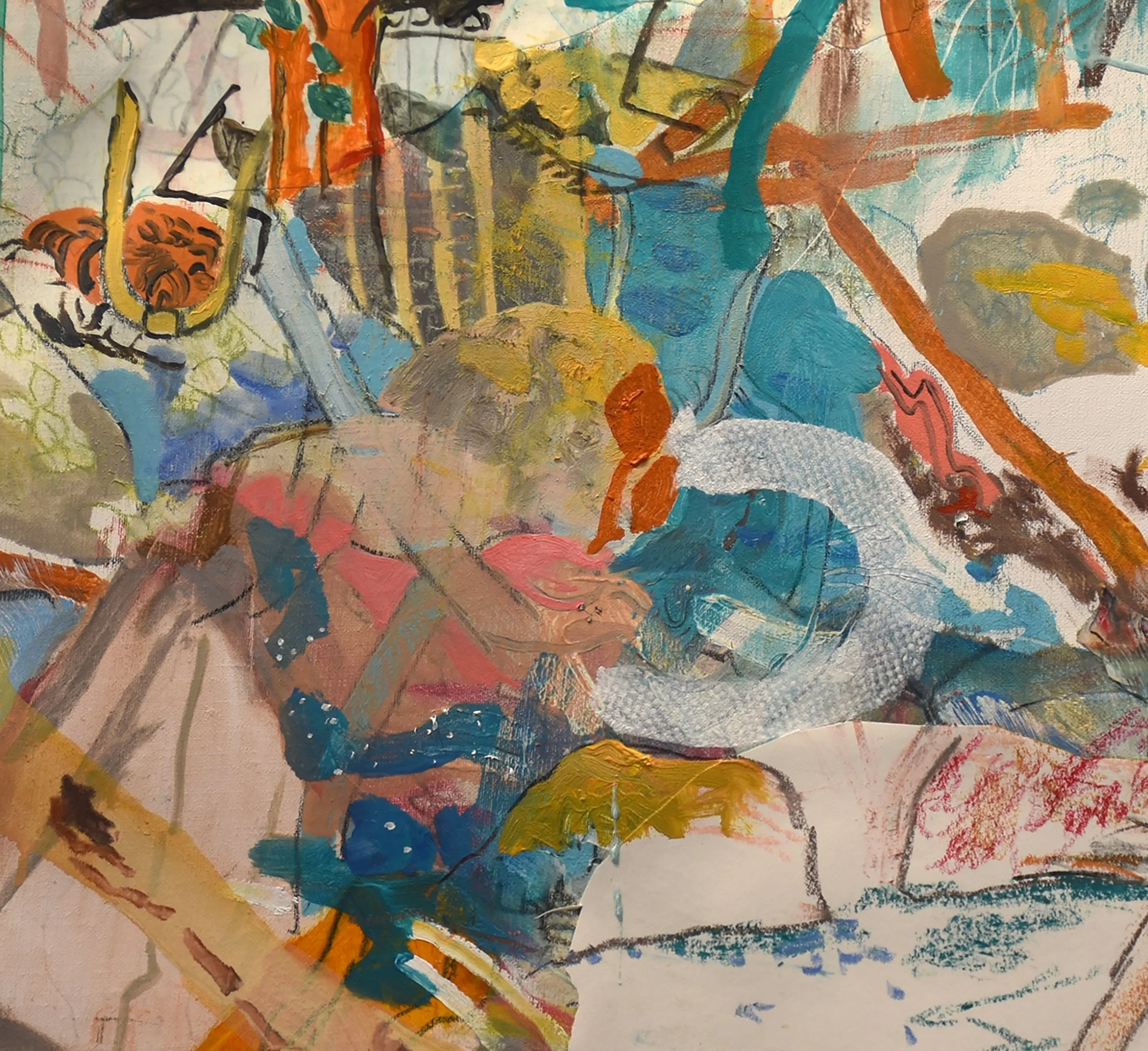 3:21 PM: today i focused my attention on july 7 creek. initially, my intention was the to somehow resolve the blankness of the white space on the upper left. soon however, mt attention shifted to the entire left half of the composition. i think it’s a more interesting series of marks and colors now, but still unresolved, and may have gotten too busy. more work is definitely needed tomorrow.