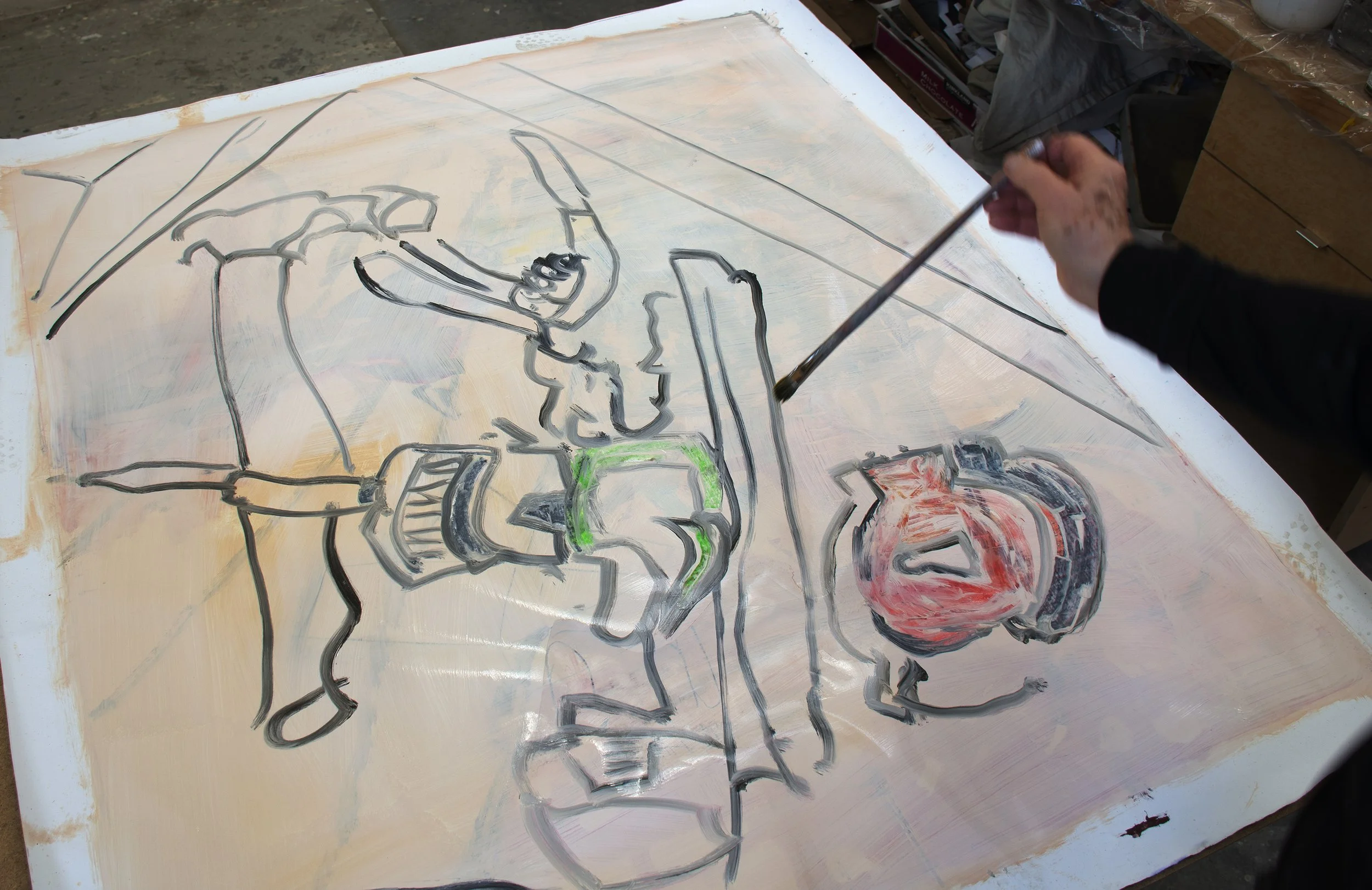 12:24 PM: you could say I was in a mood. I was tired of the direction I was taking over the past 2 days with this painting, so I painted over it with a light pink and then drew into that wet paint with black oil paint, and added a few highlights with oil pastels. in case you didn’t recognize them, these are the tools in one of my tool drawers. they are the subject of those black & white drawings I made and then cut up for use as collage.