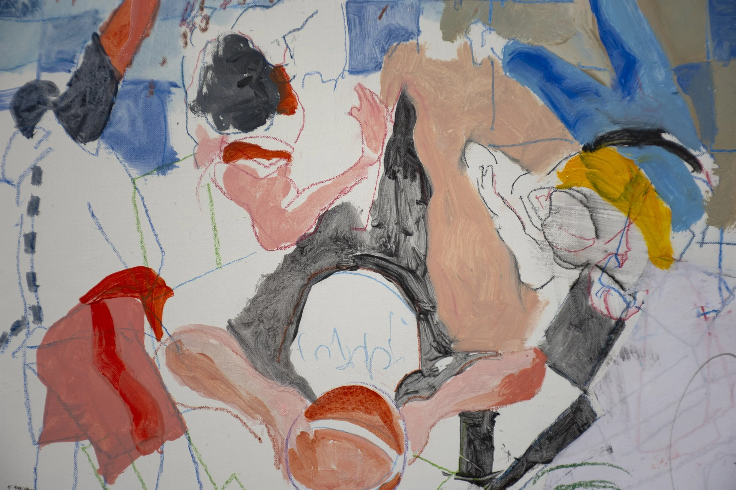 I collaged one small piece of a cut up drawing, filled in several of the outlined figures and made some changes to the checkerboard background, in eluding the colored pencil marks you see above the dancer with the red arm. the checkered pants of the dancer on the lower right echo the blue checkered background and the socks of the dancer on the left.