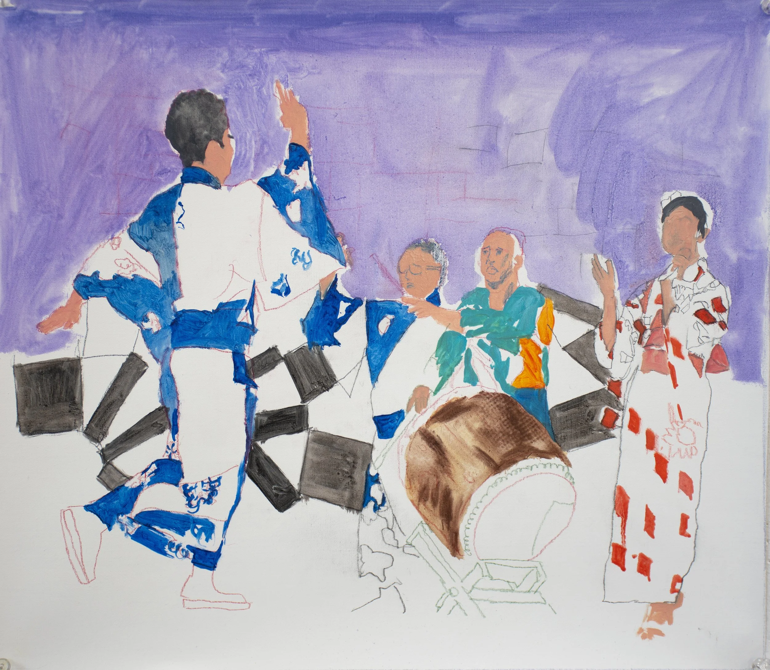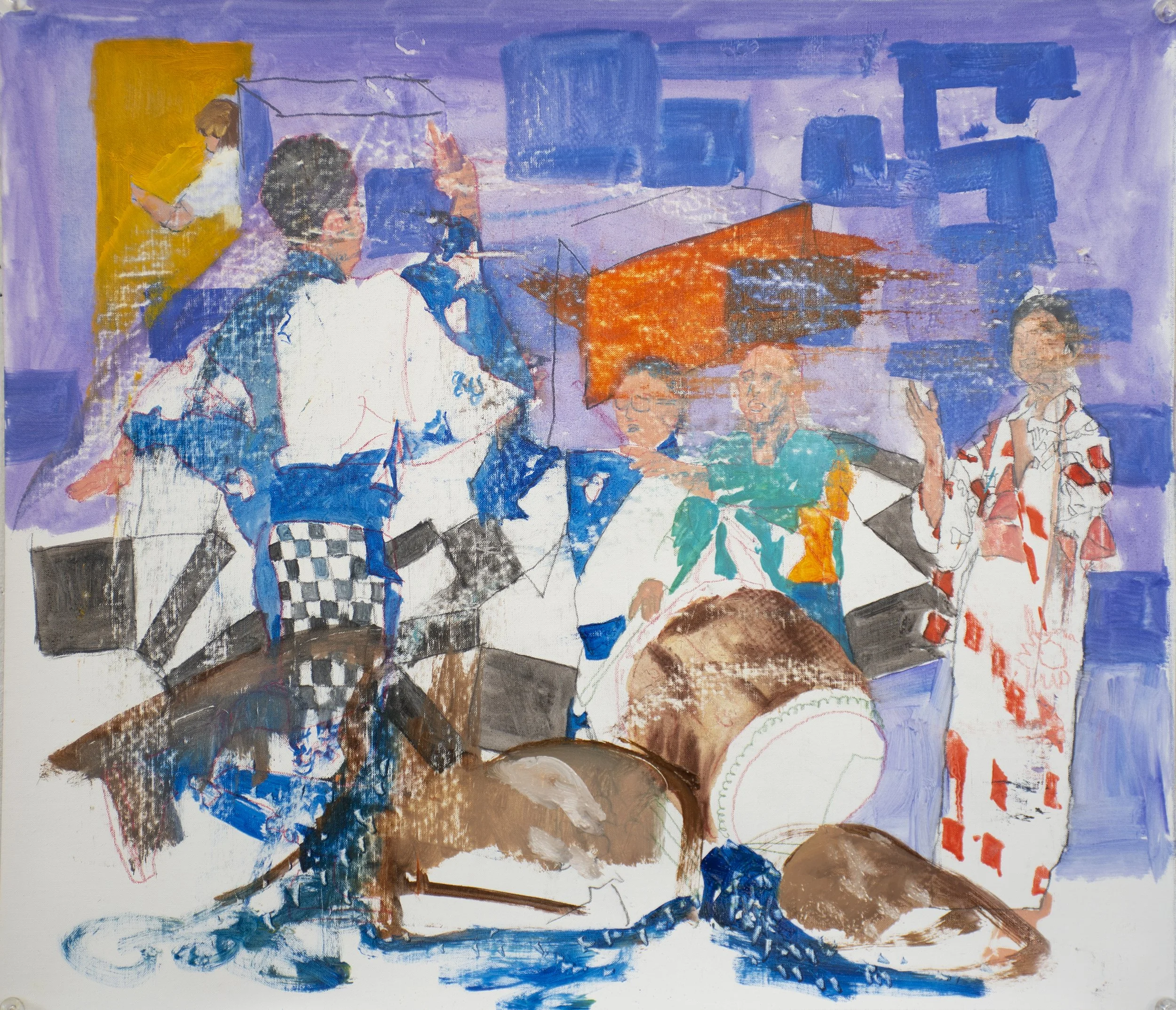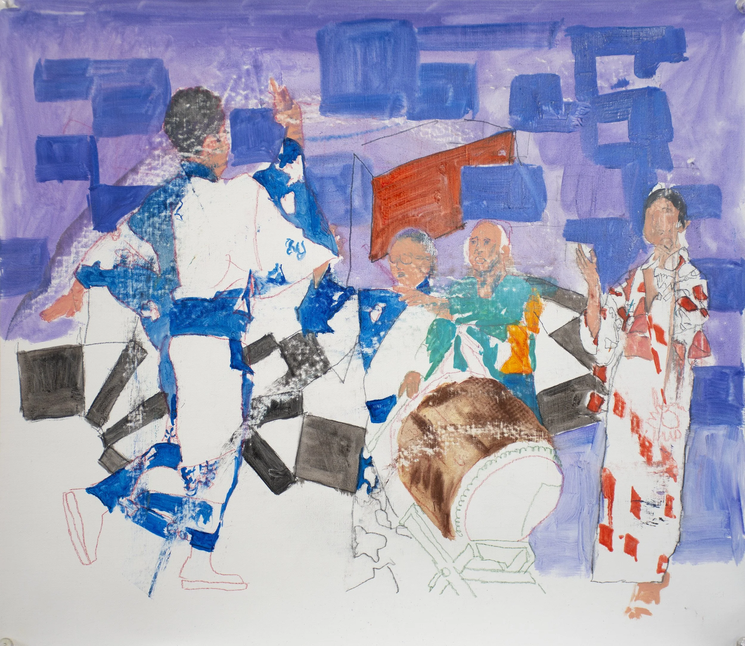 1:10 PM: yesterday afternoon I did lots of work on canvas 17 & figured i’d pick up where I left off today. but when I gave it my first glance, it seemed resolved, so I moved on to canvas 18. I feel like a locomotive roaring down the tracks. I can’t stop, so watch out! this one has started out as a realist depiction of celebrating musicians/dancers, once again at the 2020 tokyo olympics celebration.