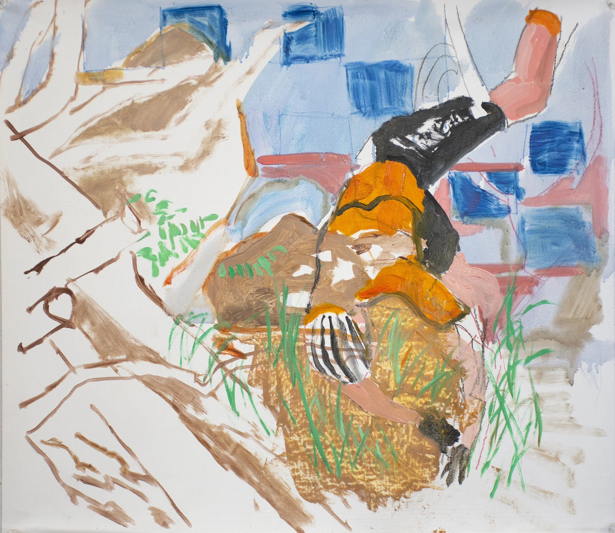 2:46 PM: I made the first marks today on this next painting in my polyptych series: canvas 19. here are the first two stages. i’m still working, so i’ll post more later in the afternoon. all i’ll say right now is that the central (and only) figure is a tokyo olympics competition bicyclist flying off his bike, upside down.