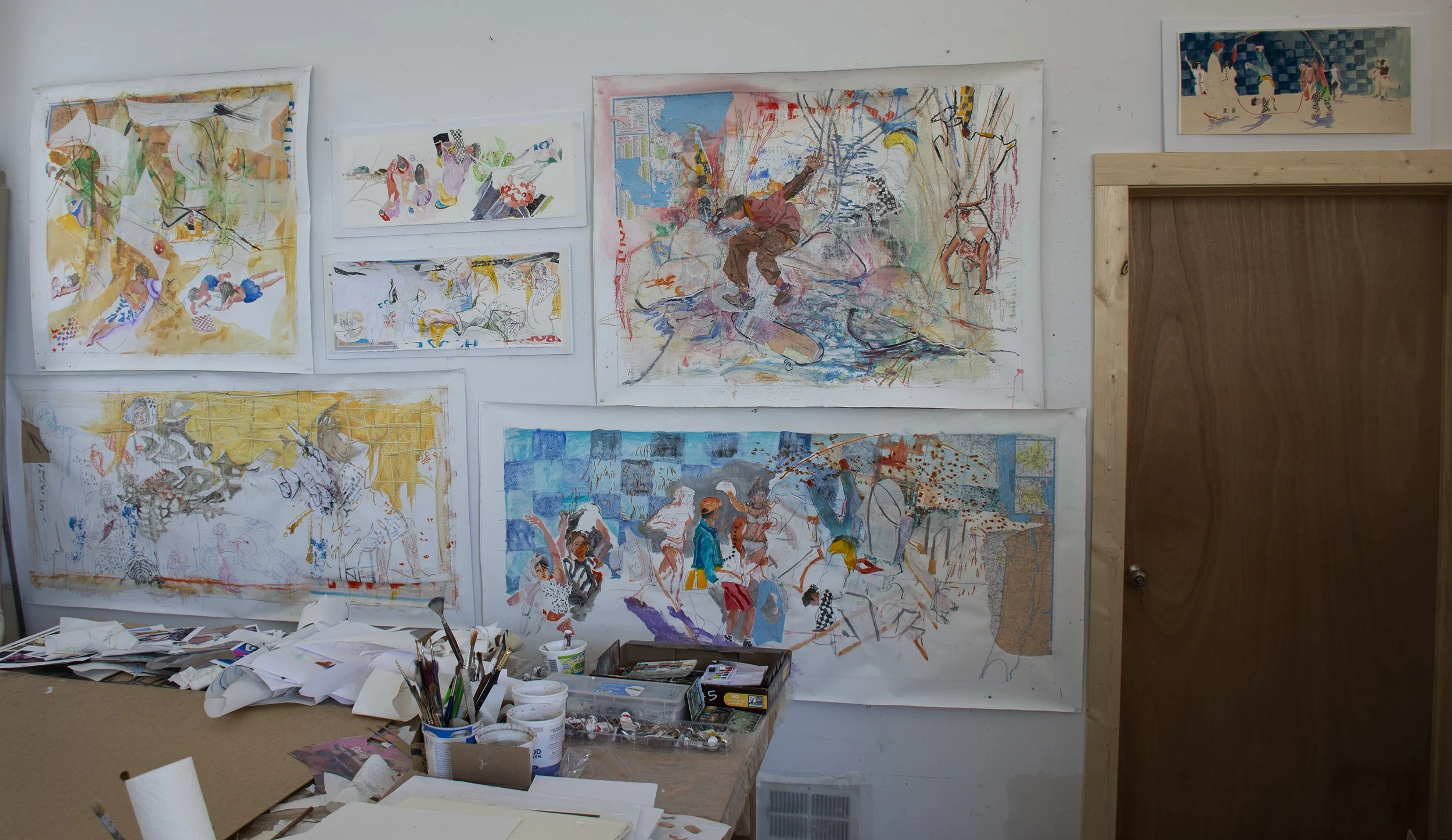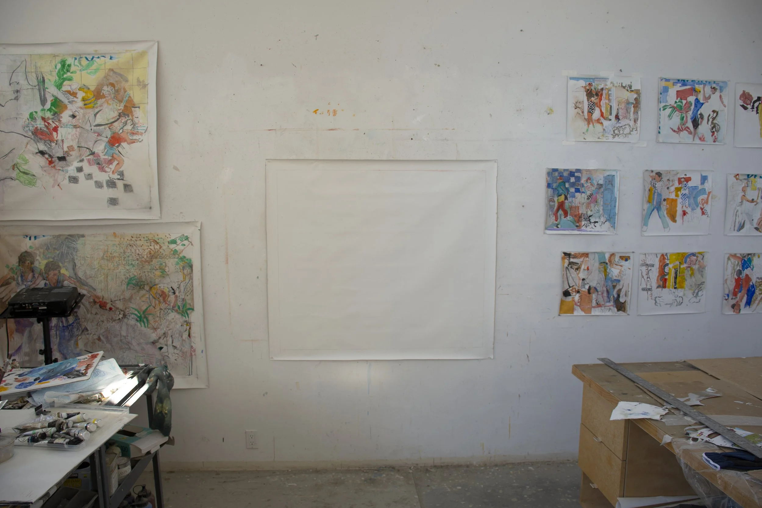 my south facing studio wall with the painting I completed yesterday now on the lower right