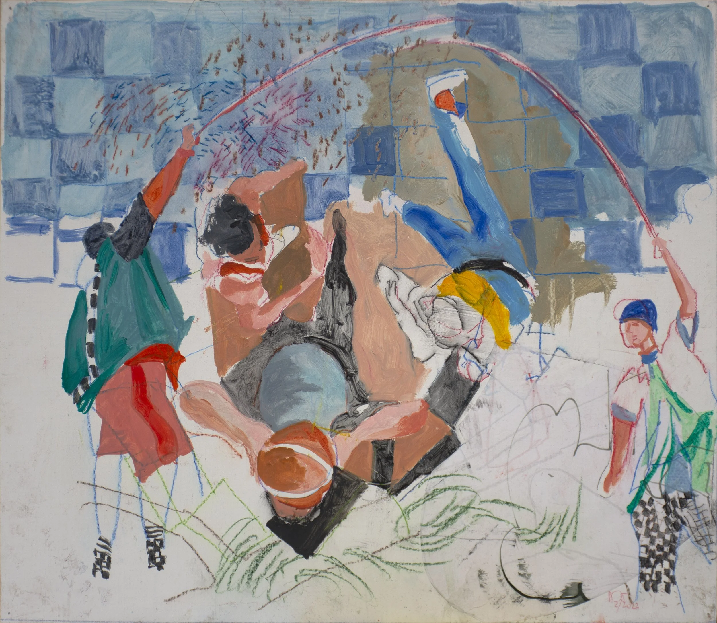 10:51 AM: this morning as scheduled, a construction friend came over to my studio to cut down the 4x8 ft. masonite boards as supports for the 18 canvases in the polyptych series . I mounted one to see how it looks and it’s pretty cool. the collaging had created ripples in the portrait linen, so it was hard to get a sense of how they’d look if they were laying flat. so here’s the first one. he went to fetch a roller, which will make the other 18 easier to mount & roll out the air bubbles, which in this first one I had to do by hand.