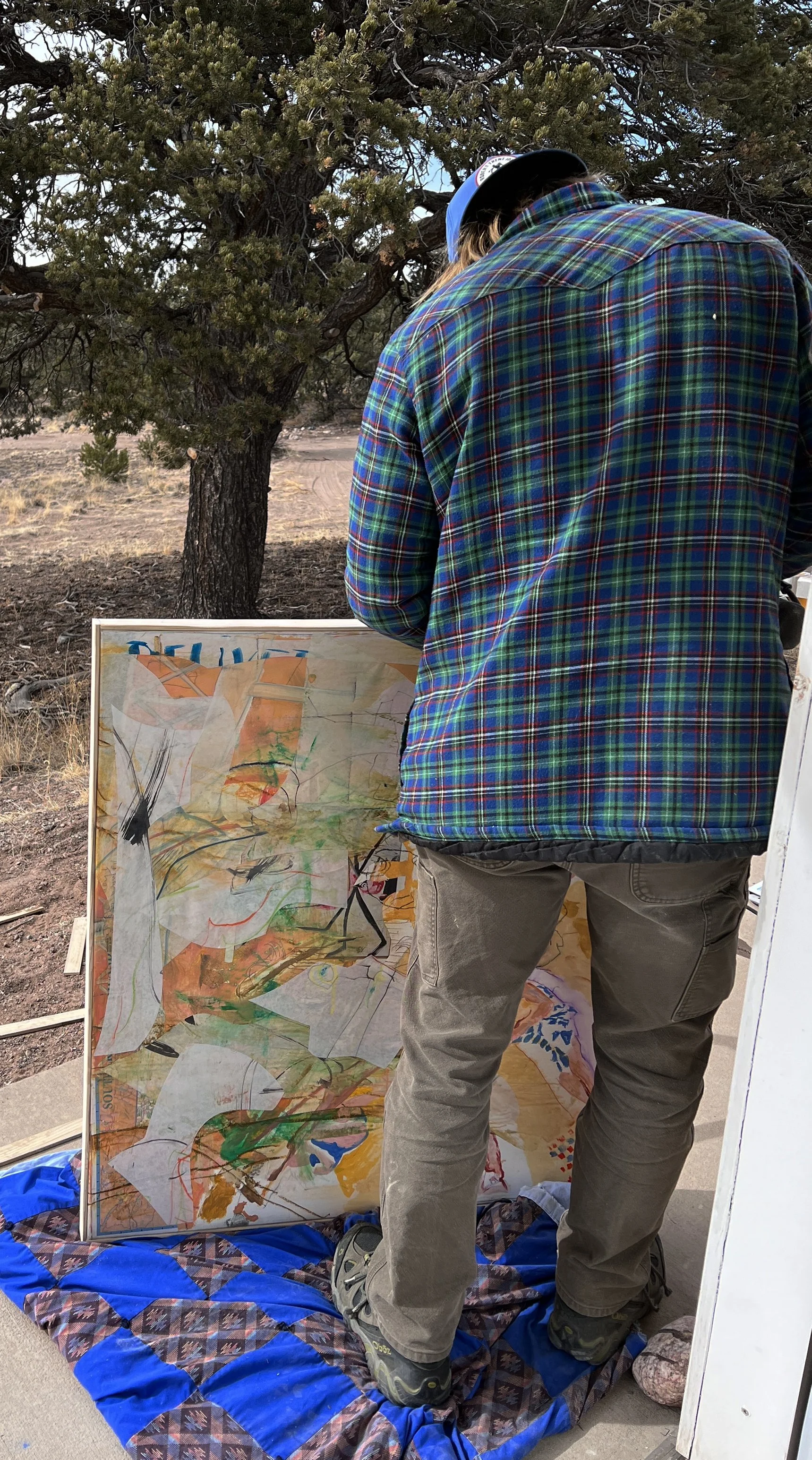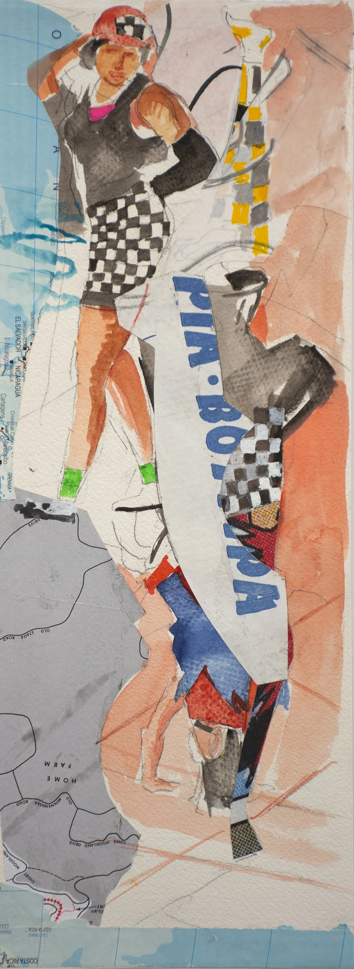 2:55 PM: while R was mounting the wood stripping frames on my paintings, I worked on watercolor/collage # 10 of 12. it’s in the same vibe as the others, and i’ve used maps plus a piece of the wrapper from a greek bakery I kept in my pile of papers used for collaging. that’s what the blue lettering in the central portion of the composition is.
