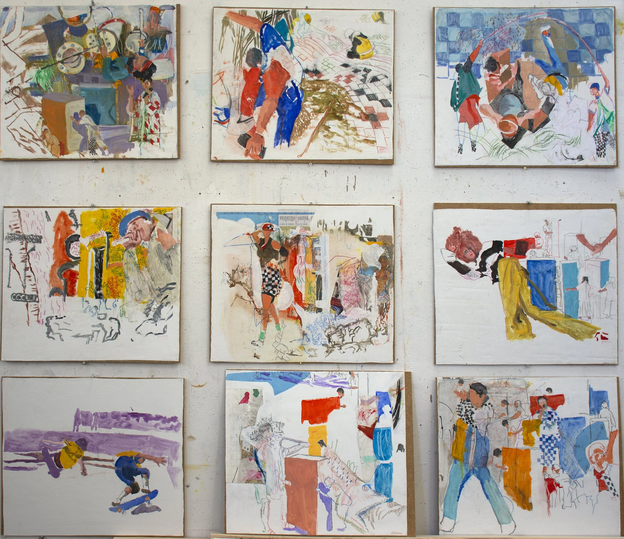 3:57 PM: today i mounted 3 more out of a total of 19 paintings inmy polyptych series. it’s a messy, difficult process making sure the surface is perfectly flat & air bubble free before the acrylic bonding liquid dries. as you press out the air bubbles, excess sticky acrylic oozes out the edges and needs to be cleaned off. i’m employing lots of old washcloths to accomplich that, which i plop into a basin of water once i’m done.not my favorite activity!
