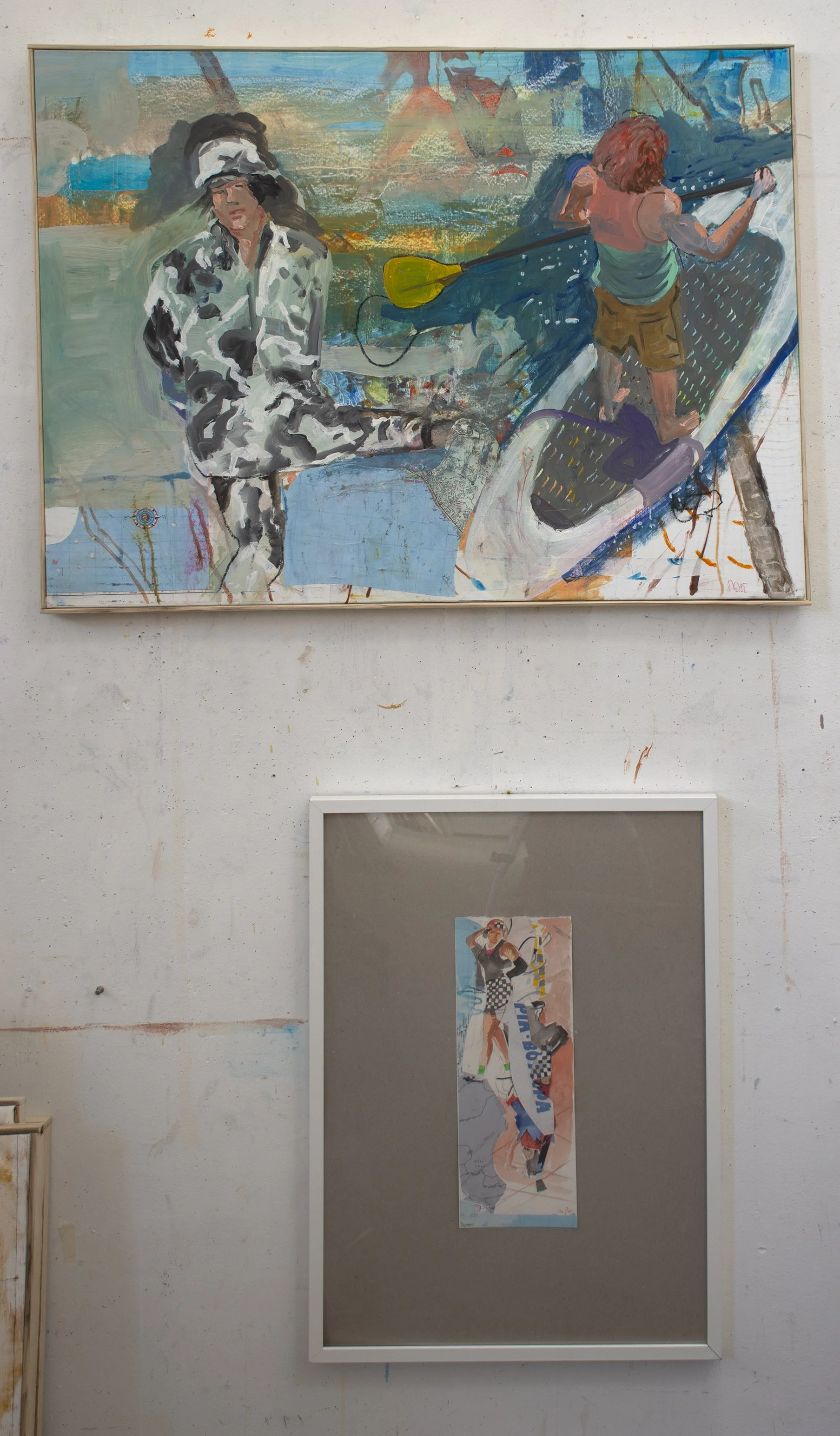 here’s a shot of two of the paintings that will be in the show. on top is 2/28/2022 oil/collage 29x38” and in the white frame beneath it is one of the 12 watercolor/collages. I like the grey mat board it’s posted on, so I just ordered more, which should arrive in a week.