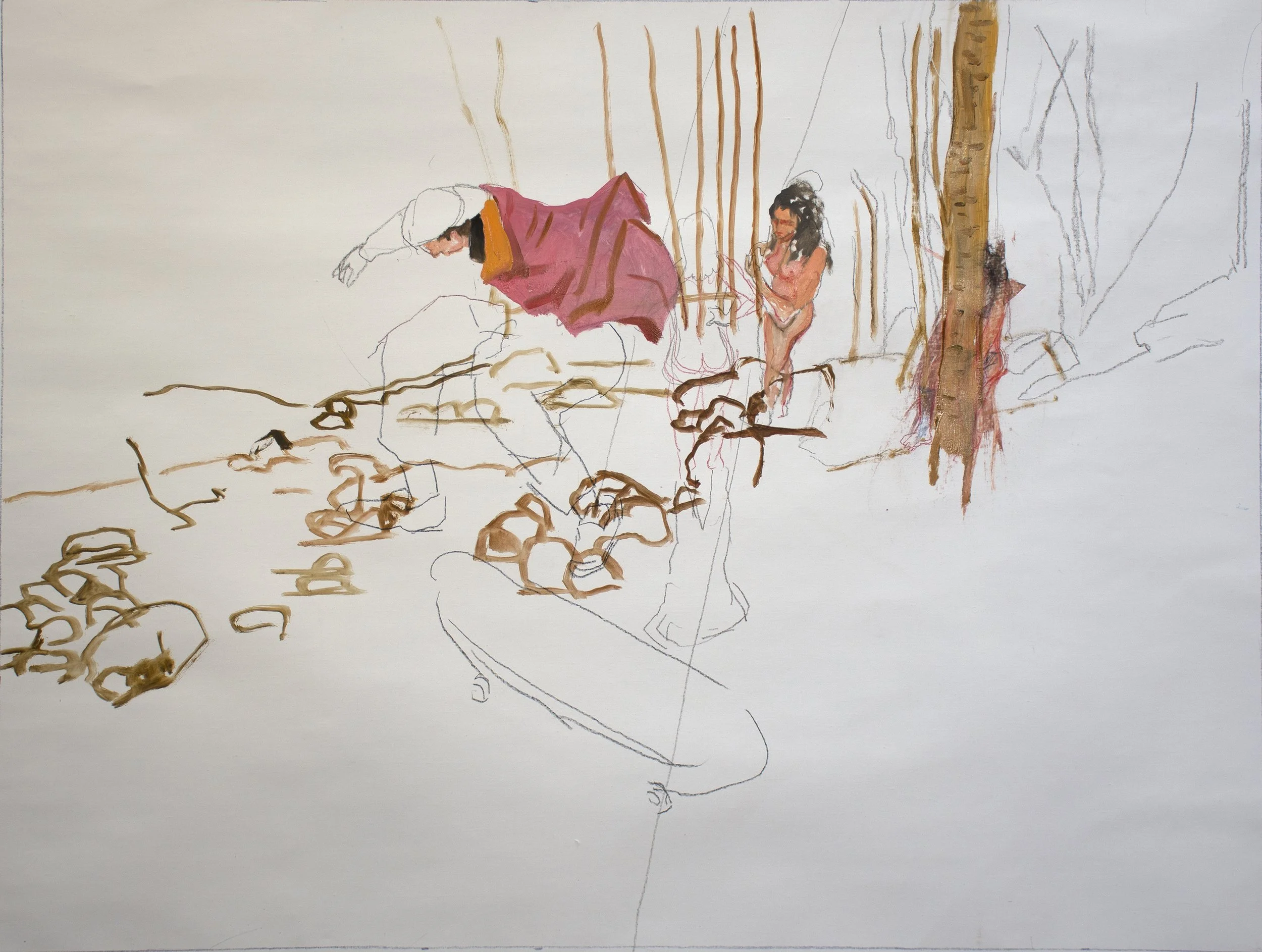 3:22 PM: this is day 1 of my new painting: 3/5/2022 oil/collage. there are a few figures from previous paintings in this series, for now set in a creek-scape sketched out in siena. the jumping skateboarder, is partially painted in amongst the trees, and a sense of mystery is pervasive.