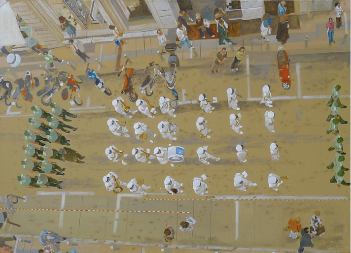 3:32 PM: ANO KATO means topsy-turvy in greek. the series began with the painting you see on the right, titled parade. it's based on photographs i took of a parade in athens in 2009. it was shown in my 2010 solo show at skoufa gallery, athens, and is now in a private collection. it was the inspiration for a series of paintings based upon images as seen from above, which as always been a passion of mine. the ANO KATO exhibition took place in houston, texas at gremillion & co. fine art in november, 2015.