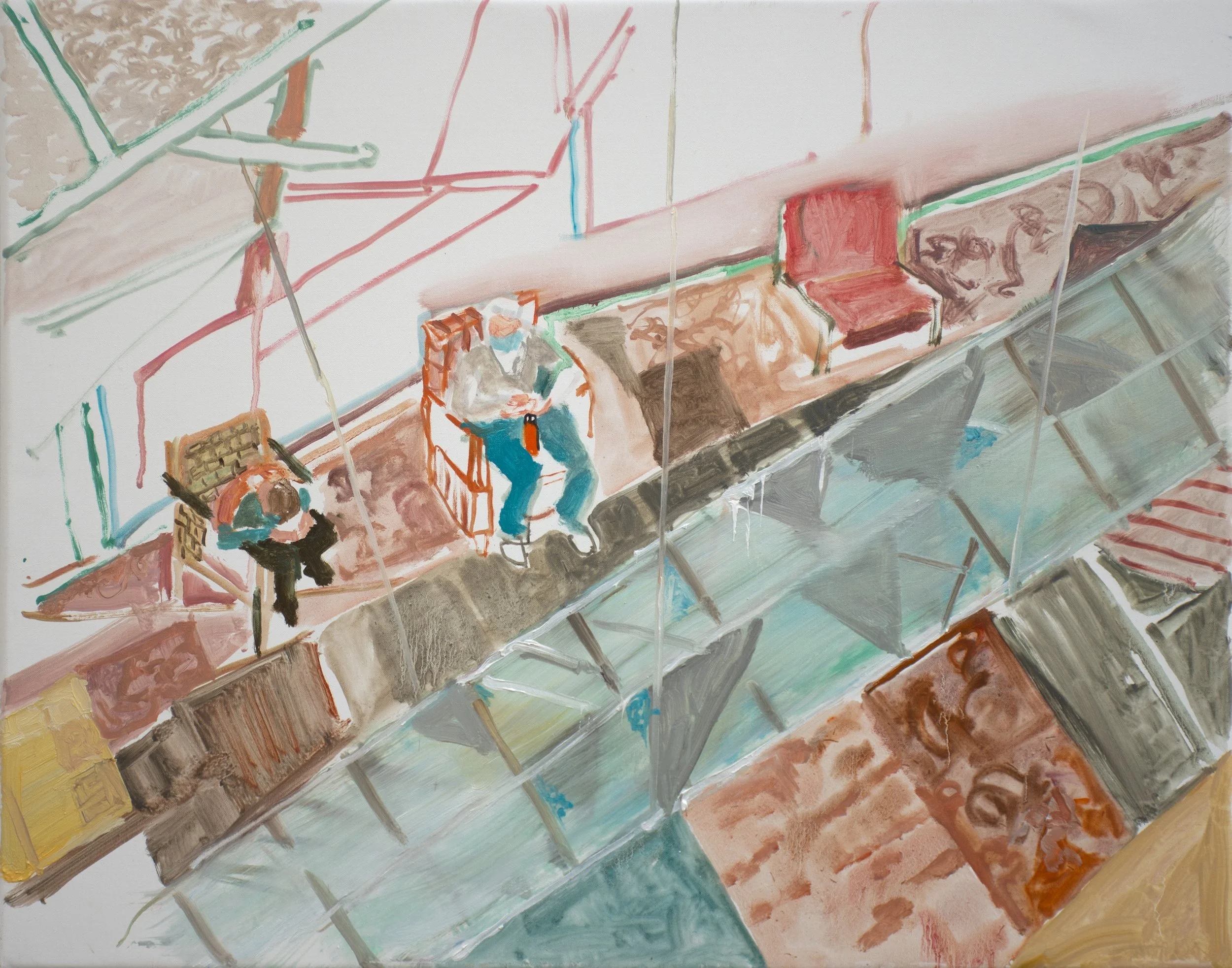 1:35 PM: I started 5-14-22 anschutz interior 2 this morning. like the previous painting, this one is inspired by photos I shot from an upper floor at anschutz, where I go for my appointments with my eye surgeon. as I make these new paintings, all of which are 16x20,” i’m noticing how interesting the architectural design of the building is from any angle. it’s so cool that you can be standing on any floor and look down at the patients moving about in a space with constantly shifting light, against a backdrop of subtle lines and patterns playing off against each other.