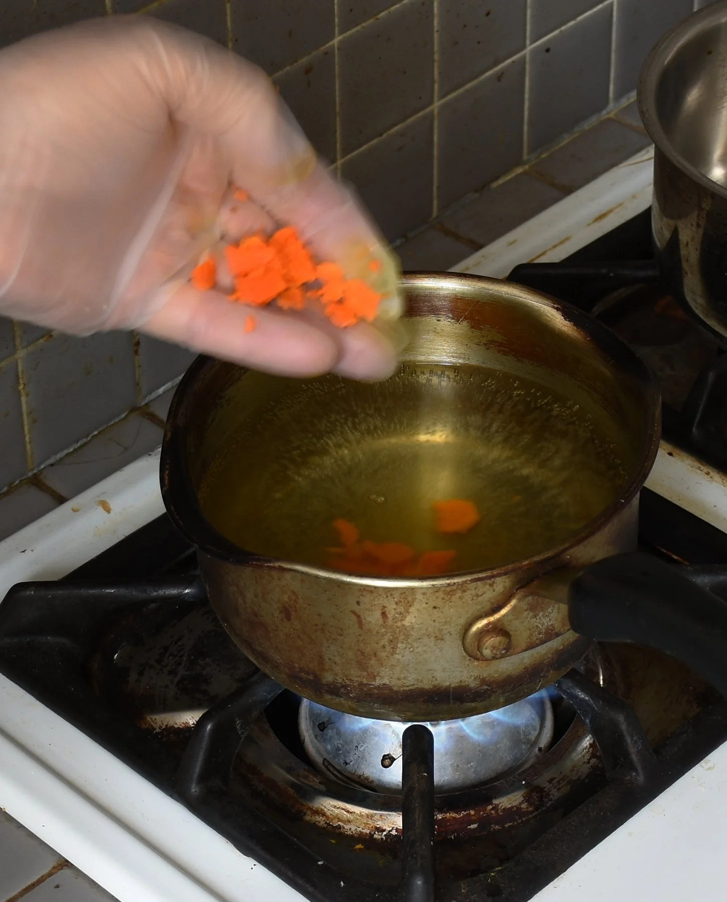 i’m wearing gloves because the turmeric stains and is difficult to get off your hands. once you have all the ingredients in the pot of water, let it simmer for about 15 minutes. then turn off the heat and let it sit for another 15 minues. i use maple syrup as a sweetener. the purpose of the olive oil & black pepper is to allow the body to more easily and fully absorb the tumeric.