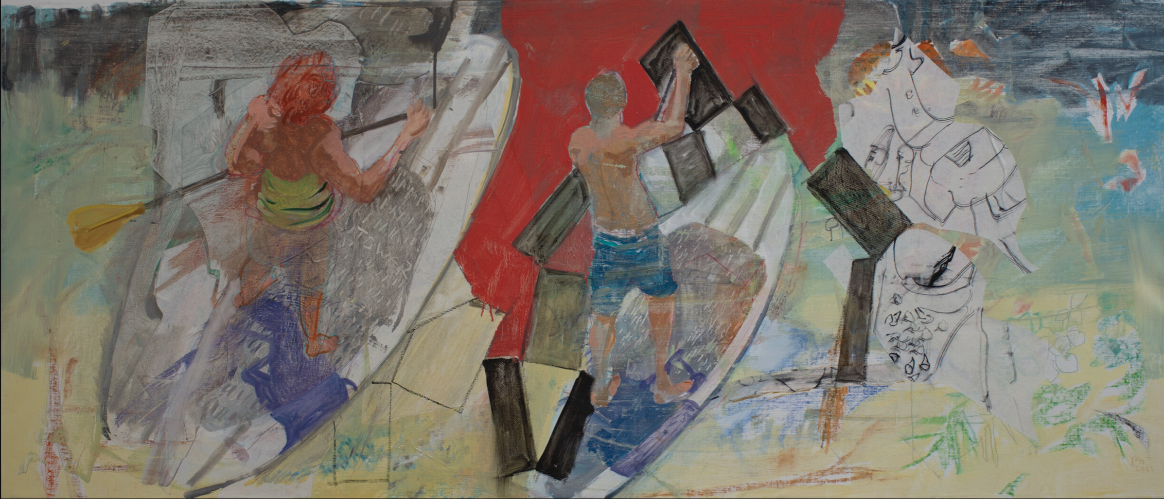 paddlers on bright yellow, 38x44” oil & collage on portrait linen