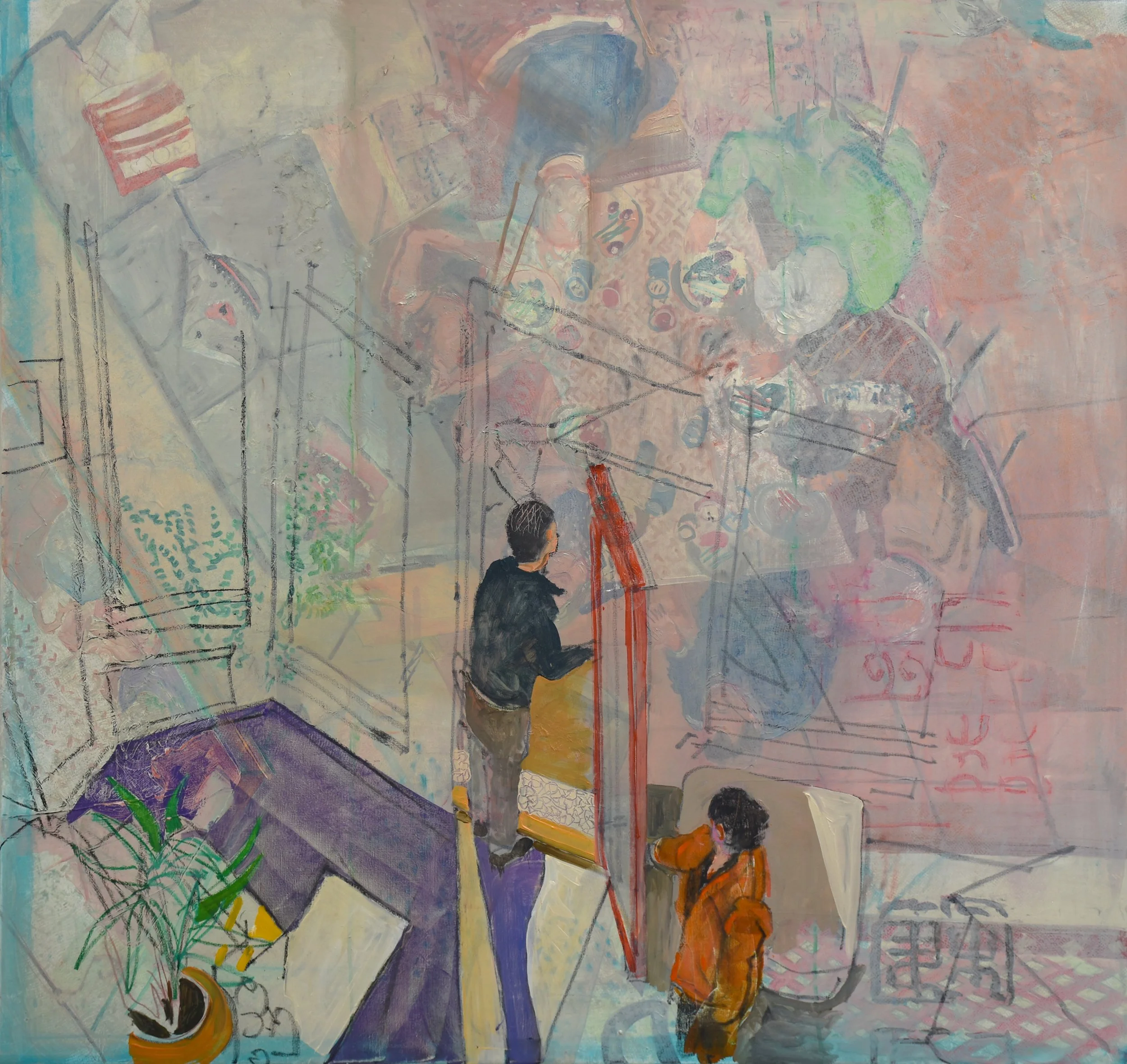whereas in the new couch, at least at this point in it’s evolution, the space in the foreground is pretty clearly laid out, while in the upper half of the composition, ghost images peak the imagination. the female figure in the lower right opens the red door for a guy delivereing the new couch…or is he looking out in awe on ill defined objects flying in space?